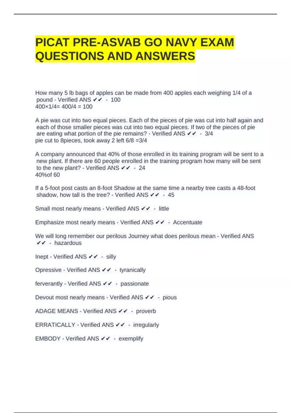 PICAT PRE-ASVAB GO NAVY EXAM QUESTIONS AND ANSWERS.