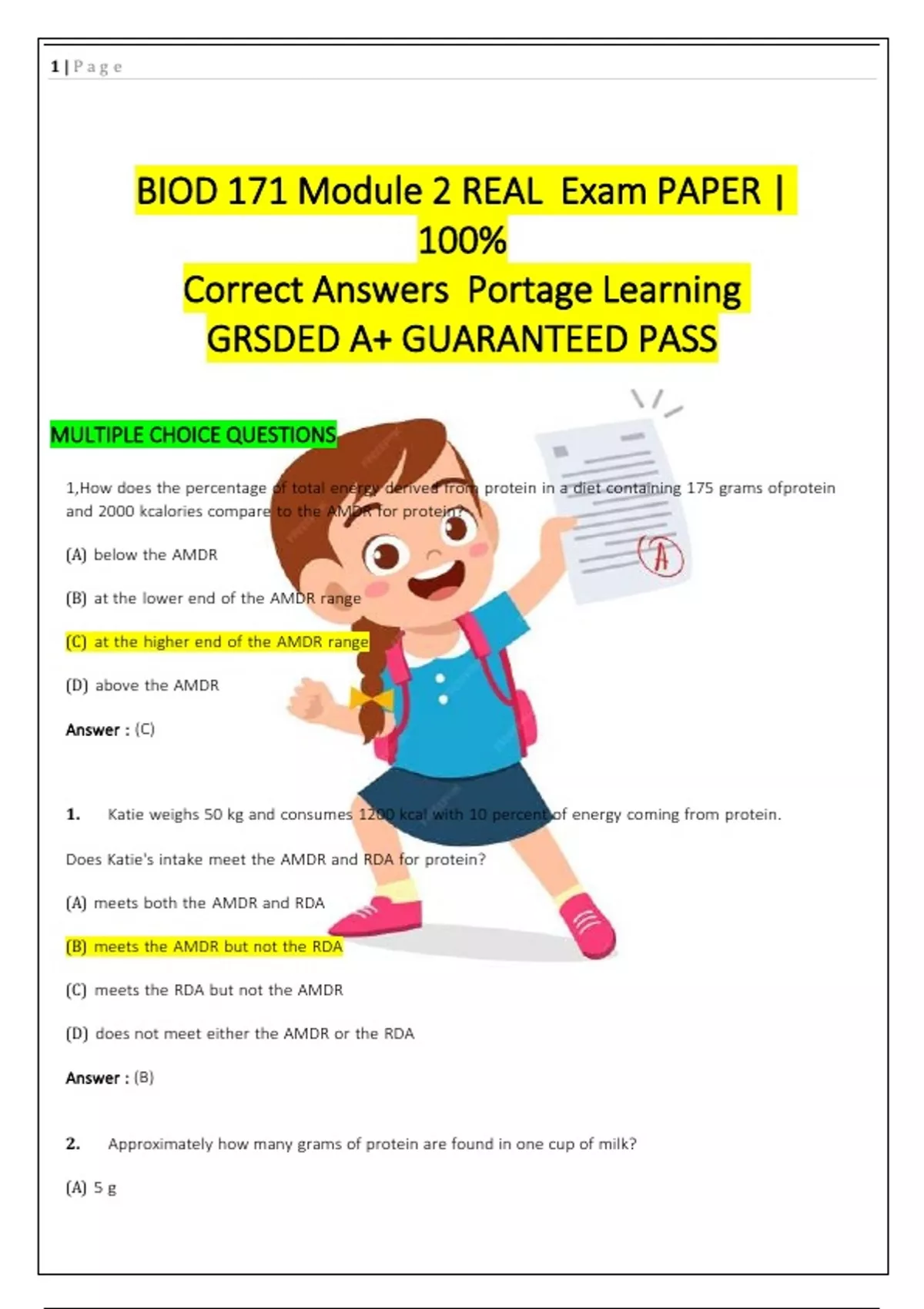BIOD 171 Module 2 REAL Exam PAPER | 100% Correct Answers Portage Learning GRSDED A+ GUARANTEED PASS MULTIPLE CHOICE QUESTIONS 1,How does the percentage of total energy derived from protein in a diet containing 175 grams ofprotein and 2000 kcalories compare to the AMDR for protein? (A) below the AMDR (B) at the lower end of the AMDR range (C) at the higher end of the AMDR range (D) above the AMDR Answer : (C) 1. Katie weighs 50 kg and consumes 1200 kcal with 10 percent of energy coming from protein. Does Katie's intake meet the AMDR and RDA for protein? (A) meets both the AMDR and RDA (B) meets the AMDR but not the RDA (C) meets the RDA but not the AMDR (D) does not meet either the AMDR or the RDA Answer : (B) 2. Approximately how many grams of protein are found in one cup of milk? (A) 5 g 2 | P a g e (B) 8 g (C) 12 g (D) 25 g Answer : (B) 3. Many athletes consume whey protein in an effort to build muscle. Which of the following arethey actually consuming? (A) a synthetic amino acid supplement (B) a chemical extract from gelatin (C) a product of cheese production (D) pork by-products Answer : (C) 4. Which of the following features distinguishes branched-chain amino acids from other amino acids? (A) They are all dispensable amino acids. (B) Large doses may suppress ammonia production. (C) They represent the major energy source for muscle tissue. (D) They may be helpful in treatment of advanced liver failure. Answer : (D) 5. What amino acid supplement has been advertised in the popular media for treating herpes infections? (A) lysine (B) arginine (C) tryptophan (D) phenylalanine Answer : (A) 3 | P a g e 6. Jim, a college baseball player, tells you that he has started to take glutamine supplements.Which of the following would be the best advice for him? (A) As long as he keeps the dose under 10 grams/day, the benefits outweigh the costs. (B) Because he plays baseball, he should consider taking alanine supplements instead. (C) Because he plays baseball, he should consider taking tryptophan supplements instead. (D) Because single amino acids do not occur naturally in foods, they offer no benefit to the body and may even be harmful. Answer : (D) 7. Which amino acid has been linked to the development of the rare blood disorder eosinophilia myalgia in people who took it as a supplement? (A) glycine (B) arginine (C) tryptophan (D) phenylalanine Answer : (C) 8. The disease phenylketonuria is related to the abnormal metabolism of which of the following nutrients? (A) urea (B) hemoglobin (C) insulin 9. Of the following elements associated with macronutrients, which one is found exclusively in proteins? (A) carbon (B) oxygen (C) hydrogen (D) nitrogen