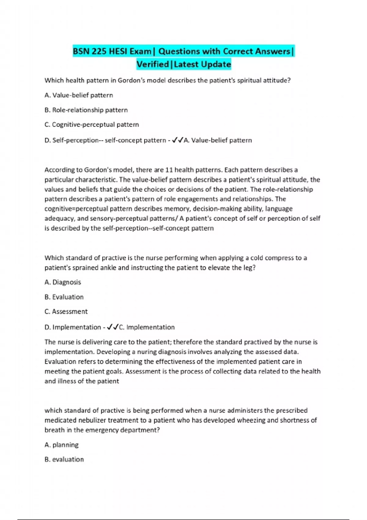 BSN 225 HESI Exam| Questions with Correct Answers| Verified|Latest Update