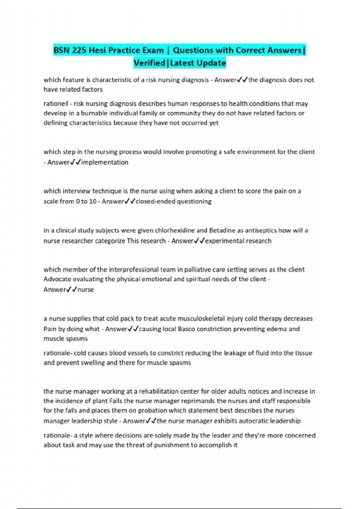 BSN 225 Hesi Practice Exam | Questions with Correct Answers| Verified|Latest Update