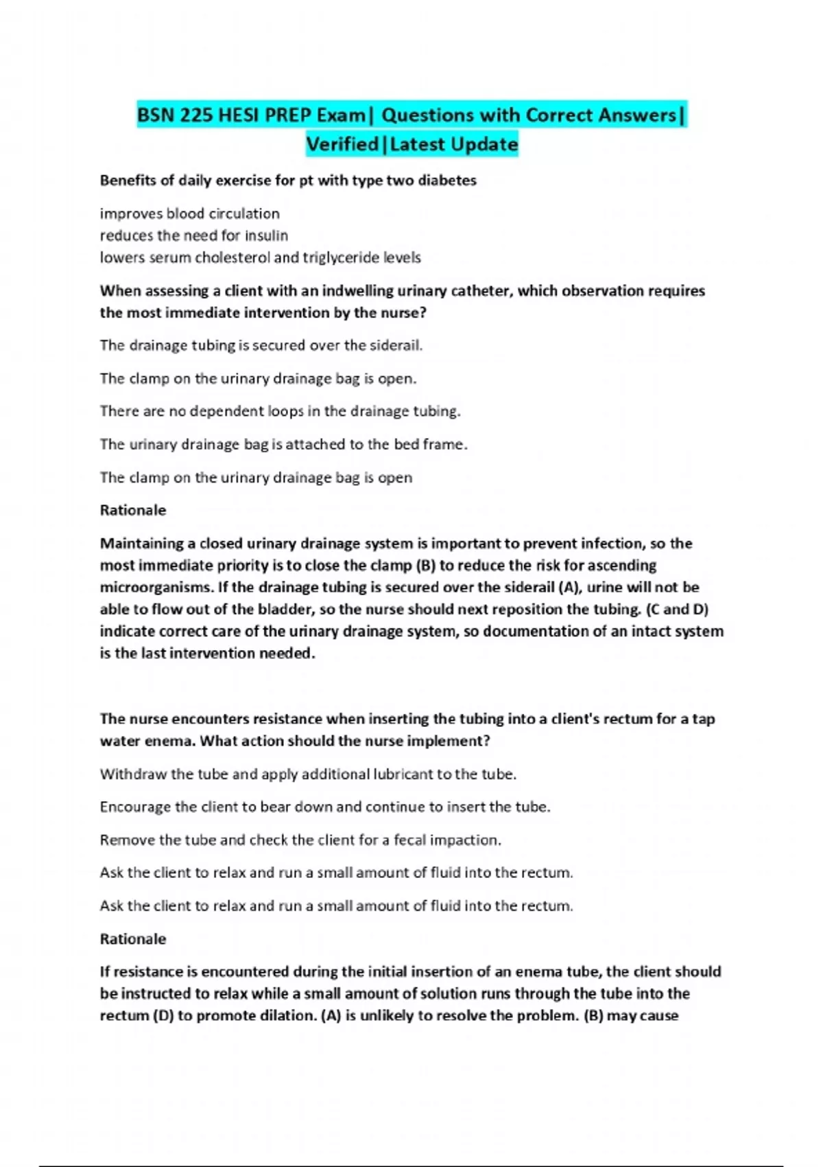 BSN 225 HESI PREP Exam| Questions with Correct Answers| Verified|Latest Update