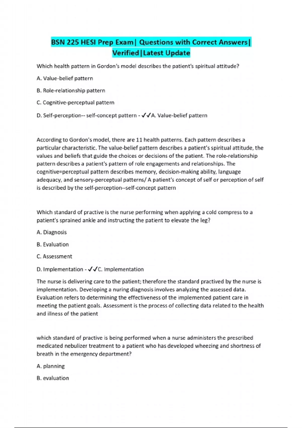 BSN 225 HESI Prep Exam| Questions with Correct Answers| Verified|Latest Update
