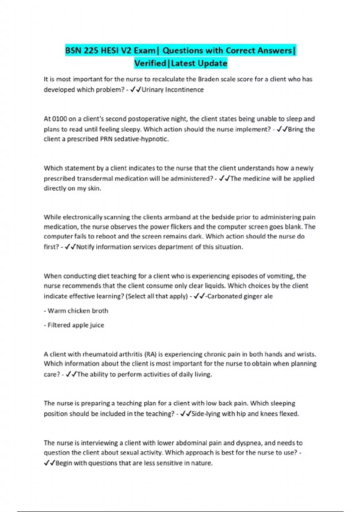 BSN 225 HESI V2 Exam| Questions with Correct Answers| Verified|Latest Update