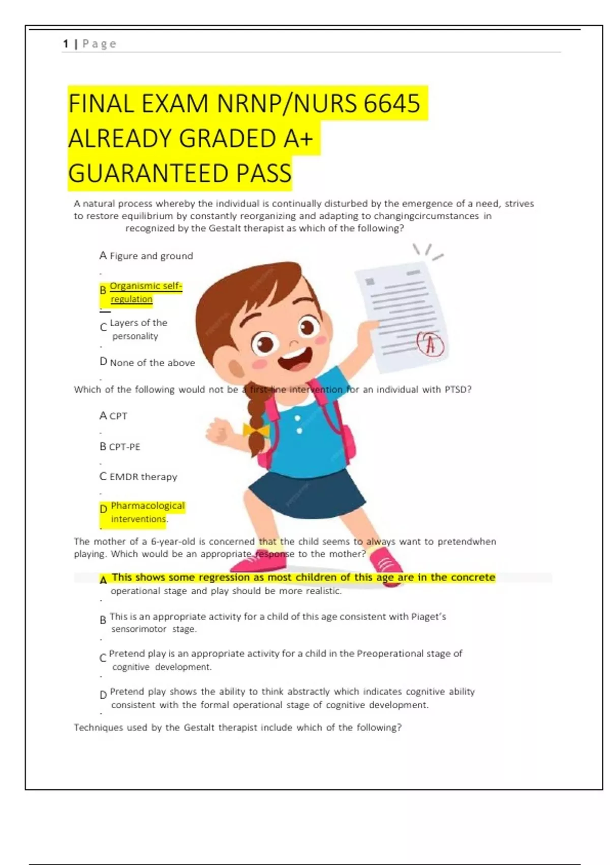 FINAL EXAM NRNP/NURS 6645 ALREADY GRADED A+ GUARANTEED PASS A natural process whereby the individual is continually disturbed by the emergence of a need, strives to restore equilibrium by constantly reorganizing and adapting to changingcircumstances in recognized by the Gestalt therapist as which of the following? A Figure and ground . B Organismic self- . regulation C Layers of the . personality D None of the above . Which of the following would not be a first-line intervention for an individual with PTSD? A CPT . B CPT-PE . C EMDR therapy . D Pharmacological . interventions. The mother of a 6-year-old is concerned that the child seems to always want to pretendwhen playing. Which would be an appropriate response to the mother? . operational stage and play should be more realistic. B This is an appropriate activity for a child of this age consistent with Piaget’s . sensorimotor stage. C Pretend play is an appropriate activity for a child in the Preoperational stage of . cognitive development. D Pretend play shows the ability to think abstractly which indicates cognitive ability . consistent with the formal operational stage of cognitive development. Techniques used by the Gestalt therapist include which of the following? 2 | P a g e A Self-regulation is a developmental milestone of childhood in which the child controls A The ability to provide homework . B The ability to craft creative experiments . C The ability to establish an authentic I-Thou relationship with . the patient. D B and C . When doing psychotherapy with older adult’s accommodations which target cognitivesymptoms and functional deficits include: A Shorter, more frequent sessions . B Summarizing previous sessions . C Quizzing patient on previous sessions . D Insist the patient bring a notebook and . take note The advanced practice psychiatric nurse encourages a patient with gambling addiction to develop a relapse prevention plan. Which of the following is true about a relapse preventionplan? A relapse prevention plan includes identifying triggers to the patient’s gambling and A a variety of coping strategies to avoid or successfully manage triggers without . reverting to gambling. B A relapse prevention plan should be completed during the initial stage of treatment. . C The main focus of a relapse prevention plan is on changing behaviors. . D The main focus of a relapse prevention plan is on cognitive or thought processes to . decrease the desire to gamble Which of the following is not true about self-regulation as it applies to therapy with children? . behavior in the service of socially desirable conduct. B Self-regulation is a pivotal developmental process of integrating emotion, memory . and behavior. C Self-regulation mechanisms from a neuroscience perspective are basic mechanisms . predominantly located in the globus pallidus. D Self-regulation issues are often seen in various child psychopathology. . 3 | P a g e A Appropriate for cognitively intact to moderately impaired older Which of the following is not consistent with a “traditional” treatment frame? A Enforcing established starting and ending times for each session. . B Establishing and enforcing a clear policy in regard to payment. . C Canceling sessions if the patient arrives under the influence of alcohol or . psychoactive drugs. D Disclosing home or cellular phone number of therapist for emergency use . only. Which of the following is consistent with Life Review Therapy? . adults. B Focuses on past event or experiences, not current events. . C The patient is typically self-focused, usually experiencing a life . event trigger. D Results in decreased isolation. . The advanced practice psychiatric nurse working with a child exposed to a traumatic eventusing traumafocused cognitive behavioral therapy recognizes E in the acronym PRACTICE represents which therapeutic component of this therapeutic approach? A Exposure . B Education . C Energizing . D Enhancing . safety 1. In child psychotherapy consideration of systems that promote a child’s ongoing development include which of the following? A Peers . B Family . C School . D Communi . ty
