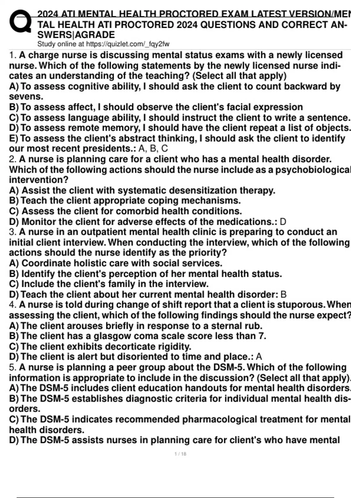 1. A charge nurse is discussing mental status exams with a newly licensed