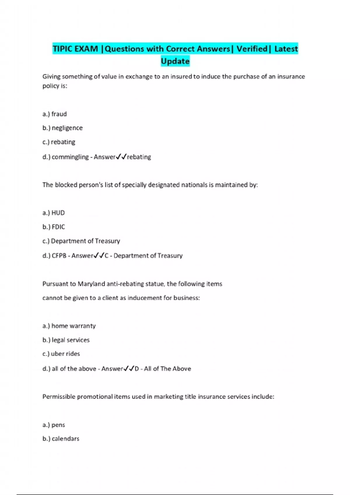TIPIC EXAM |Questions with Correct Answers| Verified| Latest Update