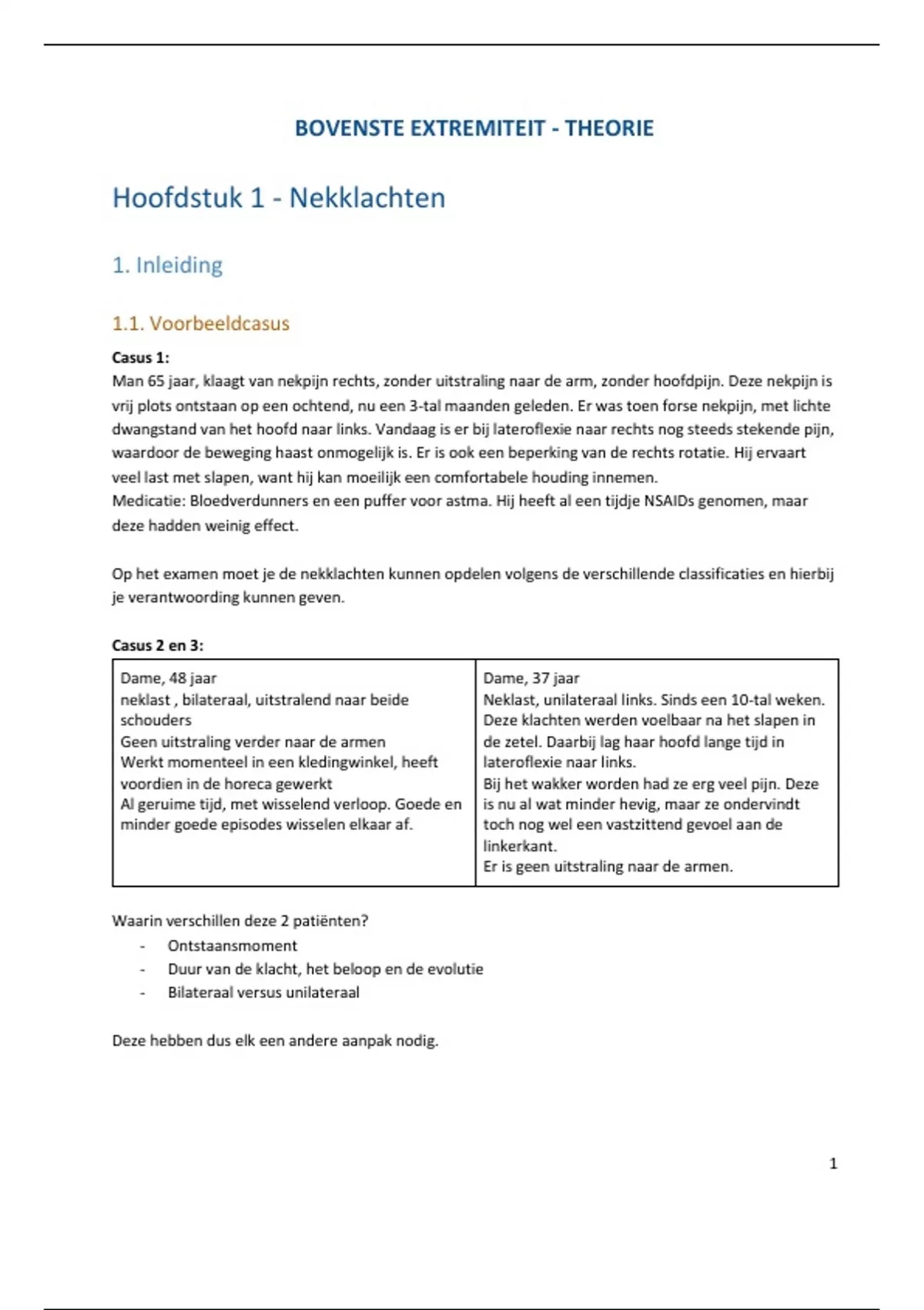 Op het examen moet je de nekklachten kunnen opdelen volgens de verschillende classificaties en hierbij