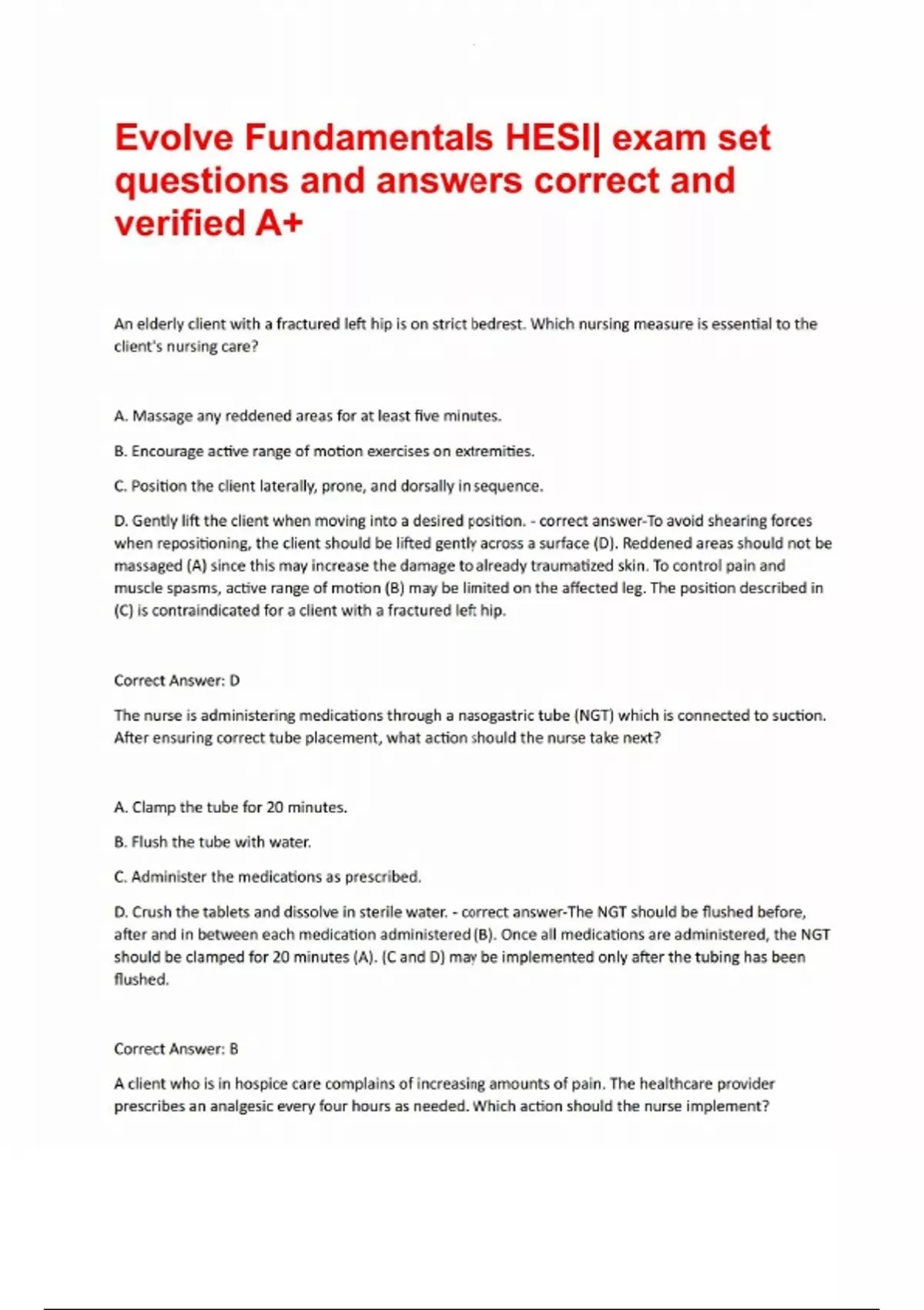 Evolve Fundamentals HESI| exam set questions and answers correct and verified A+Evolve Fundamentals HESI| exam set questions and answers correct and verified A+ An elderly client with a fractured left hip is on strict bedrest. Which nursing measure is essential to the client's nursing care? A. Massage any reddened areas for at least five minutes. B. Encourage active range of motion exercises on extremities. C. Position the client laterally, prone, and dorsally in sequence. D. Gently lift the client when moving into a desired position. - correct answer-To avoid shearing forces when repositioning, the client should be lifted gently across a surface (D). Reddened areas should not be massaged (A) since this may increase the damage to already traumatized skin. To control pain and muscle spasms, active range of motion (B) may be limited on the affected leg. The position described in (C) is contraindicated for a client with a fractured left hip. Correct Answer: D The nurse is administering medications through a nasogastric tube (NGT) which is connected to suction. After ensuring correct tube placement, what action should the nurse take next? A. Clamp the tube for 20 minutes. B. Flush the tube with water. C. Administer the medications as prescribed. D. Crush the tablets and dissolve in sterile water. - correct answer-The NGT should be flushed before, after and in between each medication administered (B). Once all medications are administered, the NGT should be clamped for 20 minutes (A). (C and D) may be implemented only after the tubing has been flushed. Correct Answer: B A client who is in hospice care complains of increasing amounts of pain. The healthcare provider prescribes an analgesic every four hours as needed. Which action should the nurse implement? A. Give an around-the-clock schedule for administration of analgesics. B. Administer analgesic medication as needed when the pain is severe. C. Provide medication to keep the client sedated and unaware of stimuli. D. Offer a medication-free period so that the client can do daily activities. - correct answer-The most effective management of pain is achieved using an around-the-clock schedule that provides analgesic medications on a regular basis (A) and in a timely manner. Analgesics are less effective if pain persists until it is severe, so an analgesic medication should be administered before the client's pain peaks (B). Providing comfort is a priority for the client who is dying, but sedation that impairs the client's ability to interact and experience the time before life ends should be minimized (C). Offering a medication-free period allows the serum drug level to fall, which is not an effective method to manage chronic pain (D). Correct Answer: A When assessing a client with wrist restraints, the nurse observes that the fingers on the right hand are blue. What action should the nurse implement first? A. Loosen the right wrist restraint. B. Apply a pulse oximeter to the right hand. C. Compare hand color bilaterally. D. Palpate the right radial pulse. - correct answer-The priority nursing action is to restore circulation by loosening the restraint (A), because blue fingers (cyanosis) indicates decreased circulation. (C and D) are also important nursing interventions, but do not have the priority of (A). Pulse oximetry (B) measures the saturation of hemoglobin with oxygen and is not indicated in situations where the cyanosis is related to mechanical compression (the restraints). Correct Answer: A The nurse is assessing the nutritional status of several clients. Which client has the greatest nutritional need for additional intake of protein? A. A college-age track runner with a sprained ankle. B. A lactating woman nursing her 3-day-old infant. C. A school-aged child with Type 2 diabetes. D. An elderly man being treated for a peptic ulcer. - correct answer-A lactating woman (B) has the greatest need for additional protein intake. (A, C, and D) are all conditions that require protein, but do not have the increased metabolic protein demands of lactation. Correct Answer: B A client is in the radiology department at 0900 when the prescription levofloxacin (Levaquin) 500 mg IV q24h is scheduled to be administered. The client returns to the unit at 1300. What is the best intervention for the nurse to implement? A. Contact the healthcare provider and complete a medication variance form. B. Administer the Levaquin at 1300 and resume the 0900 schedule in the morning. C. Notify the charge nurse and complete an incident report to explain the missed dose. D. Give the missed dose at 1300 and change the schedule to administer daily at 1300. - correct answer-To ensure that a therapeutic level of medication is maintained, the nurse should administer the missed dose as soon as possible, and revise the administration schedule accordingly to prevent dangerously increasing the level of the medication in the bloodstream (D). The nurse should document the reason for the late dose, but (A and C) are not warranted. (B) could result in increased blood levels of the drug. Correct Answer: D While instructing a male client's wife in the performance of passive range-of-motion exercises to his contracted shoulder, the nurse observes that she is holding his arm above and below the elbow. What nursing action should the nurse implement? A. Acknowledge that she is supporting the arm correctly. B. Encourage her to keep the joint covered to maintain warmth. C. Reinforce the need to grip directly under the joint for better support. D. Instruct her to grip directly over the joint for better motion. - correct answer-The wife is performing the passive ROM correctly, therefore the nurse should acknowledge this fact (A). The joint that is being exercised should be uncovered (B) while the rest of the body should remain covered for warmth and privacy. (C and D) do not provide adequate support to the joint while still allowing for joint movement. Correct Answer: A What is the most imp
