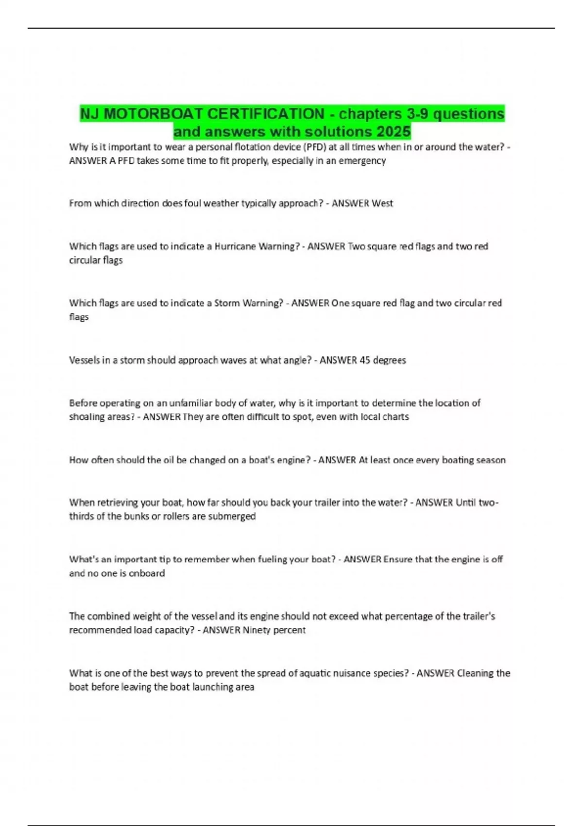 NJ MOTORBOAT CERTIFICATION - chapters 3-9 questions and answers with solutions 2025