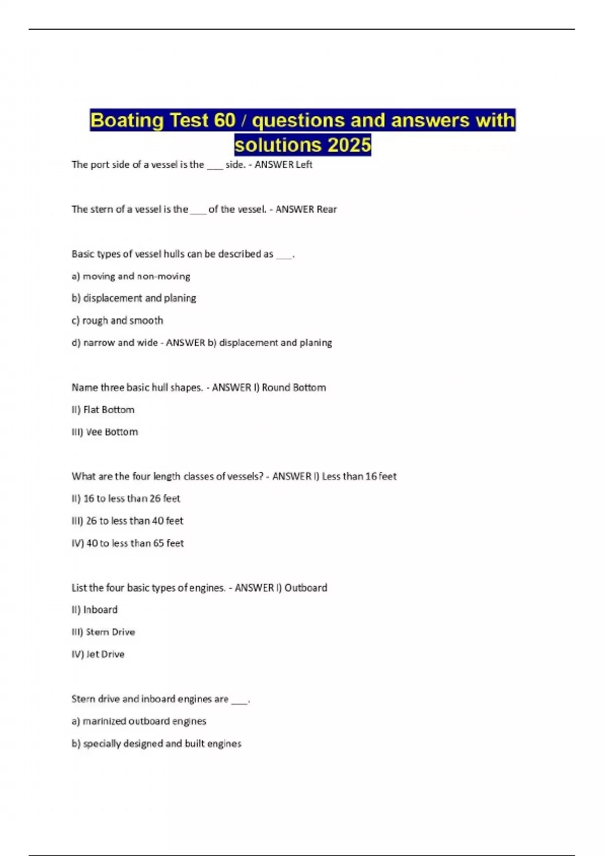 The port side of a vessel is the ___ side. - ANSWER Left The stern of a vessel is the ___ of the vessel. - ANSWER Rear Basic types of vessel hulls can be described as ___. a) moving and non-moving b) displacement and planing c) rough and smooth d) narrow and wide - ANSWER b) displacement and planing Name three basic hull shapes. - ANSWER I) Round Bottom II) Flat Bottom III) Vee Bottom What are the four length classes of vessels? - ANSWER I) Less than 16 feet II) 16 to less than 26 feet III) 26 to less than 40 feet IV) 40 to less than 65 feet List the four basic types of engines. - ANSWER I) Outboard II) Inboard III) Stern Drive IV) Jet Drive Stern drive and inboard engines are ___.