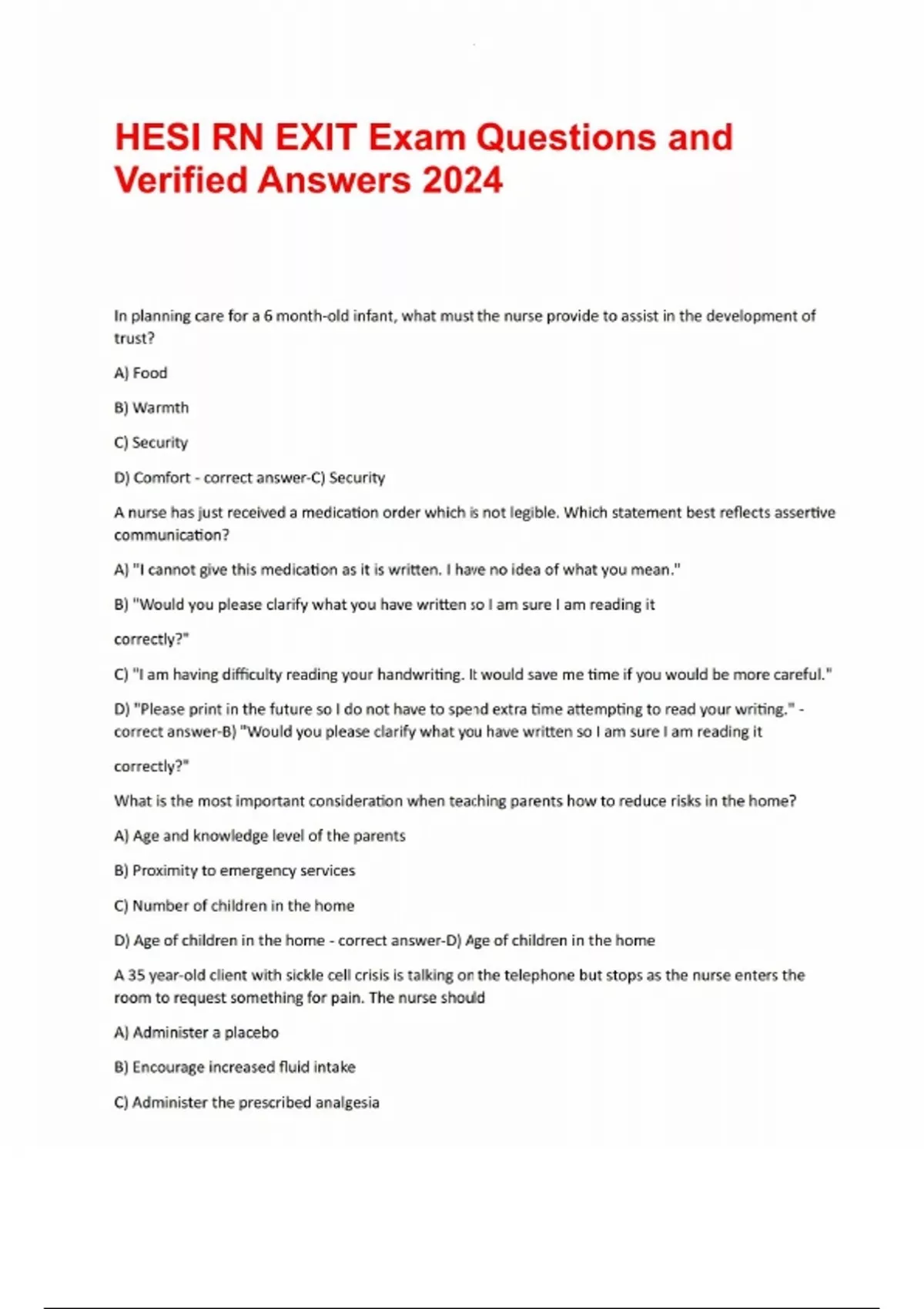 HESI RN EXIT Exam Questions and Verified Answers 2024HESI RN EXIT Exam Questions and Verified Answers 2024 In planning care for a 6 month-old infant, what must the nurse provide to assist in the development of trust? A) Food B) Warmth C) Security D) Comfort - correct answer-C) Security A nurse has just received a medication order which is not legible. Which statement best reflects assertive communication? A) "I cannot give this medication as it is written. I have no idea of what you mean." B) "Would you please clarify what you have written so I am sure I am reading it correctly?" C) "I am having difficulty reading your handwriting. It would save me time if you would be more careful." D) "Please print in the future so I do not have to spend extra time attempting to read your writing." - correct answer-B) "Would you please clarify what you have written so I am sure I am reading it correctly?" What is the most important consideration when teaching parents how to reduce risks in the home? A) Age and knowledge level of the parents B) Proximity to emergency services C) Number of children in the home D) Age of children in the home - correct answer-D) Age of children in the home A 35 year-old client with sickle cell crisis is talking on the telephone but stops as the nurse enters the room to request something for pain. The nurse should A) Administer a placebo B) Encourage increased fluid intake C) Administer the prescribed analgesia D) Recommend relaxation exercises for pain control - correct answer-C) Administer the prescribed analgesia While caring for a toddler with croup, which initial sign of croup requires the nurse's immediate attention? A) Respiratory rate of 42 B) Lethargy for the past hour C) Apical pulse of 54 D) Coughing up copious secretions - correct answer-A) Respiratory rate of 42 A client is admitted with low T3 and T4 levels and an elevated TSH level. On initial assessment, the nurse would anticipate which of the following assessment findings? A) Lethargy B) Heat intolerance C) Diarrhea D) Skin eruptions - correct answer-A) Lethargy The emergency room nurse admits a child who experienced a seizure at school. The father comments that this is the first occurrence, and denies any family history of epilepsy. What is the best response by the nurse? A) "Do not worry. Epilepsy can be treated with medications." B) "The seizure may or may not mean your child has epilepsy." C) "Since this was the first convulsion, it may not happen again." D) "Long term treatment will prevent future seizures." - correct answer-B) "The seizure may or may not mean your child has epilepsy." Alcohol and drug abuse impairs judgment and increases risk taking behavior. What nursing diagnosis best applies? A) Risk for injury B) Risk for knowledge deficit C) Altered thought process D) Disturbance in self-esteem - correct answer-A) Risk for injury Which these findings would the nurse more closely associate with anemia in a 10 month-old infant? A) Hemoglobin level of 12 g/dI B) Pale mucosa of the eyelids and lips C) Hypoactivity D) A heart rate between 140 to 160 - correct answer-B) Pale mucosa of the eyelids and lips The nurse is caring for a client in hypertensive crisis in an intensive care unit. The priority assessment in the first hour of care is A) Heart rate B) Pedal pulses C) Lung sounds D) Pupil responses - correct answer-D) Pupil responses Which of these clients who are all in the terminal stage of cancer is least appropriate to suggest the use of patient controlled analgesia (PCA) with a pump? A) A young adult with a history of Down's syndrome B) A teenager who reads at a 4th grade level C) An elderly client with numerous arthritic nodules on the hands D) A preschooler with intermittent episodes of alertness - correct answer-D) A preschooler with intermittent episodes of alertness The nurse is about to assess a 6 month-old child with nonorganic failure-to thrive (NOFTT). Upon entering the room, the nurse would expect the baby to be A) Irritable and "colicky" with no attempts to pull to standing B) Alert, laughing and playing with a rattle, sitting with support C) Skin color dusky with poor skin turgor over abdomen D) Pale, thin arms and legs, uninterested in surroundings - correct answer-D) Pale, thin arms and legs, uninterested in surroundings As the nurse is speaking with a group of teens which of these side effects of chemotherapy for cancer would the nurse expect this group to be more interested in during the discussion? A) Mouth sores B) Fatigue C) Diarrhea D) Hair loss - correct answer-D) Hair loss While caring for a client who was admitted with myocardial infarction (MI) 2 days ago, the nurse notes today's temperature is 101.1 degrees Fahrenheit (38.5 degreesCelsius). The appropriate nursing intervention is to A) Call the health care provider immediately B) Administer acetaminophen as ordered as this is normal at this time C) Send blood, urine and sputum for culture D) Increase the client's fluid intake - correct answer-B) Administer acetaminophen as ordered as this is normal at this time A client is admitted for first and second degree burns on the face, neck, anterior chest and hands. The nurse's priority should be A) Cover the areas with dry sterile dressings B) Assess for dyspnea or stridor C) Initiate intravenous therapy D) Administer pain medication - correct answer-B) Assess for dyspnea or stridor Which of these clients who call the community health clinic would the nurse ask to come in that day to be seen by the health care provider? A) I started my period and now my urine has turned bright red. B) I am an diabetic and today I have been going to the bathroom every hour. C) I was started on medicine yesterday for a urine infection. Now my lower belly hurts when I go to the bathroom. D) I went to the bathroom and my urine looked very red and it didn't hurt when I went. - correct answer-D) I went to the bathroom and my urine looked very red and it didn't hurt when I went. Which of these paren