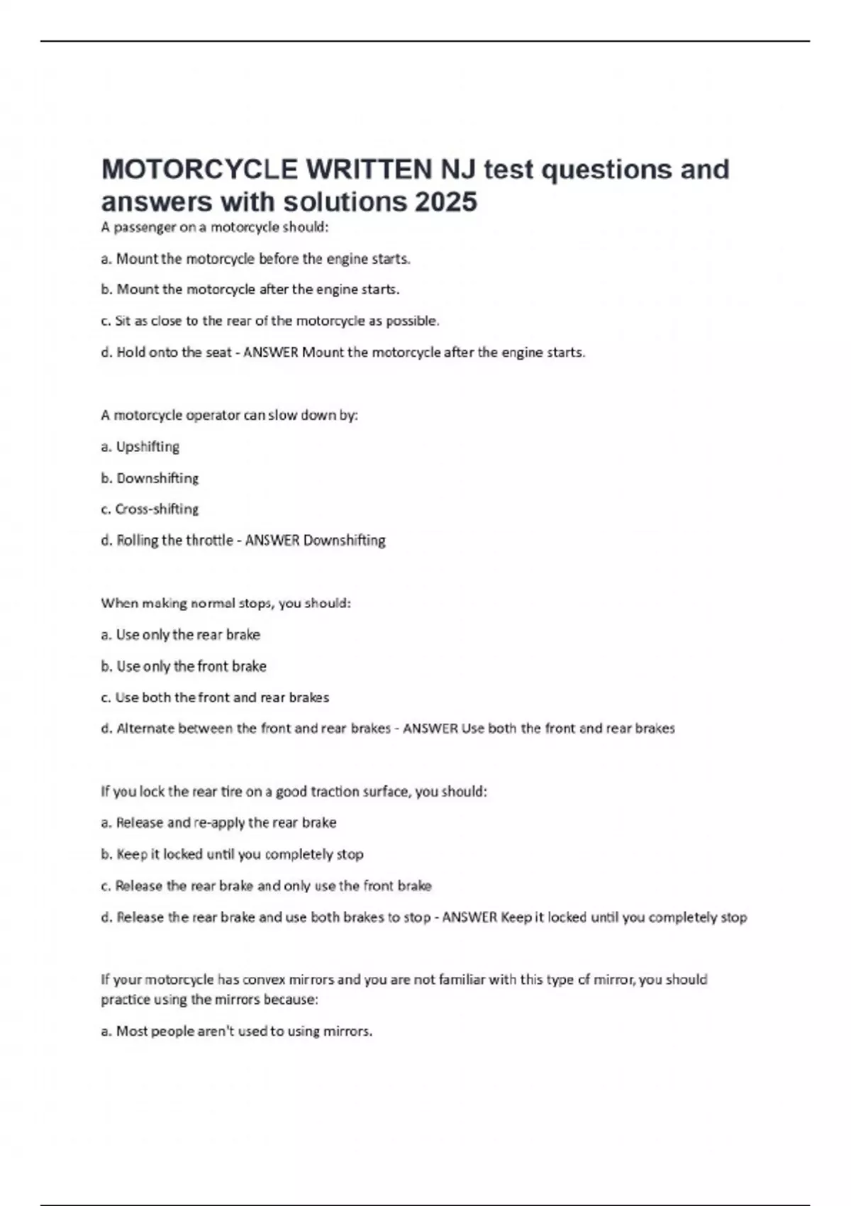 A passenger on a motorcycle should: a. Mount the motorcycle before the engine starts. b. Mount the motorcycle after the engine starts. c. Sit as close to the rear of the motorcycle as possible. d. Hold onto the seat - ANSWER Mount the motorcycle after the engine starts. A motorcycle operator can slow down by: a. Upshifting b. Downshifting c. Cross-shifting d. Rolling the throttle - ANSWER Downshifting When making normal stops, you should: a. Use only the rear brake b. Use only the front brake c. Use both the front and rear brakes d. Alternate between the front and rear brakes - ANSWER Use both the front and rear brakes If you lock the rear tire on a good traction surface, you should: a. Release and re-apply the rear brake b. Keep it locked until you completely stop c. Release the rear brake and only use the front brake d. Release the rear brake and use both brakes to stop - ANSWER Keep it locked until you completely stop If your motorcycle has convex mirrors and you are not familiar with this type of mirror, you should practice using the mirrors because: a. Most people aren't used to using mirrors. b. Unlike flat mirrors, they make items
