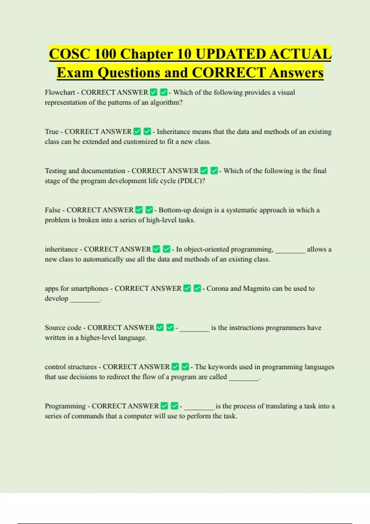 COSC 100 Chapter 10 UPDATED ACTUAL Exam Questions and CORRECT Answers Flowchart - CORRECT ANSWER - Which of the following provides a visual representation of the patterns of an algorithm? True - CORRECT ANSWER - Inheritance means that the data and methods of an existing class can be extended and customized to fit a new class