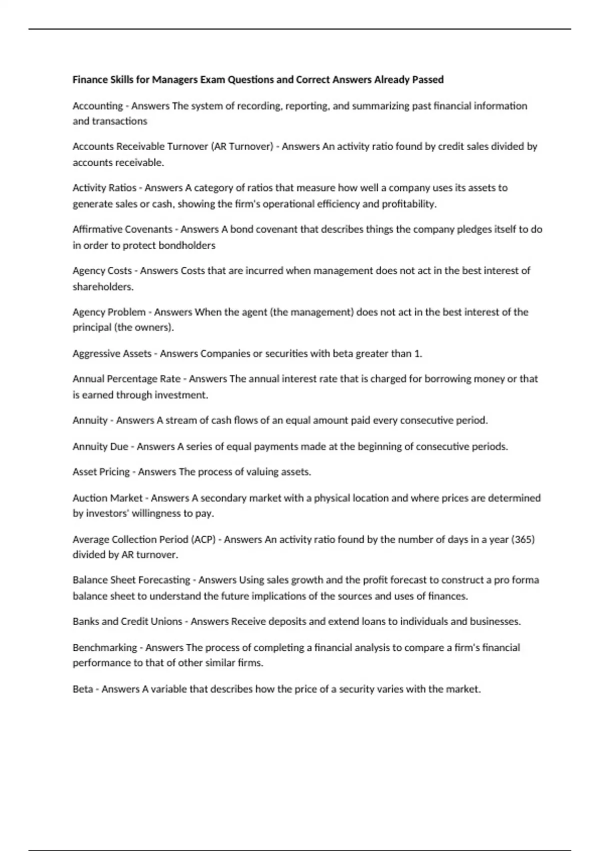 Finance Skills for Managers Exam Questions and Correct Answers Already Passed Accounting - Answers The system of recording, reporting, and summarizing past financial information and transactions Accounts Receivable Turnover (AR Turnover) - Answers An activity ratio found by credit sales divided by accounts receivable. Activity Ratios - Answers A category of ratios that measure how well a company uses its assets to generate sales or cash, showing the firm's operational efficiency and profitability. Affirmative Covenants - Answers A bond covenant that describes things the company pledges itself to do in order to protect bondholders Agency Costs - Answers Costs that are incurred when management does not act in the best interest of shareholders. Agency Problem - Answers When the agent (the management) does not act in the best interest of the principal (the owners). Aggressive Assets - Answers Companies or securities with beta greater than 1. Annual Percentage Rate - Answers The annual interest rate that is charged for borrowing money or that is earned through investment. Annuity - Answers A stream of cash flows of an equal amount paid every consecutive period. Annuity Due - Answers A series of equal payments made at the beginning of consecutive periods. Asset Pricing - Answers The process of valuing assets. Auction Market - Answers A secondary market with a physical location and where prices are determined by investors' willingness to pay. Average Collection Period (ACP) - Answers An activity ratio found by the number of days in a year (365) divided by AR turnover. Balance Sheet Forecasting - Answers Using sales growth and the profit forecast to construct a pro forma balance sheet to understand the future implications of the sources and uses of finances. Banks and Credit Unions - Answers Receive deposits and extend loans to individuals and businesses. Benchmarking - Answers The process of completing a financial analysis to compare a firm's financial performance to that of other similar firms. Beta - Answers A variable that describes how the price of a security varies with the market. Bid-ask Spread - Answers The difference between the bid and ask prices that compensate the specialist for the risk that he or she bears for willingness to provide liquidity. Board of Directors - Answers A group of people who jointly supervise the activities of an organization. Bond Indenture - Answers A legal contract that governs the relationship between a firm and its bondholders. Bondholders - Answers A person who loans a corporation money by buying debt securities. Business Finance - Answers An area of finance that deals with sources of funding, the capital structure of corporations, the actions that managers take to increase the value of the firm to its owners, and the tools and analysis used to allocate financial resources Cannibalization - Answers The reduction in sales of a company's own products due to introduction of another similar product. Capital - Answers A financial asset that can be used by a firm or individual. Examples of capital may be machinery or cash held by a firm. Capital Asset Pricing Model (CAPM) - Answers A model used to determine the risk-return relationship for an asset. Capital Budgeting - Answers The process of evaluation and planning for purchases of long-term assets. Capital Budgeting Criteria - Answers Metrics and calculations used to determine whether a project or asset will add value and be a worthwhile investment. Capital Investment - Answers The sum of money invested in a business to purchase long-term assets to further its objective of maximizing owner wealth. Capital Markets - Answers A type of financial market used for long-term assets that are held for greater than one year. Capital Structure - Answers The mixture of debt and equity used to finance a firm. Capital-constrained Environment - Answers When a limited amount of funds are available. Cash Budgets - Answers A plan for controlling cash inflows and outflows business to balance income with expenditures. Cash Management - Answers Managing the day-to-day finance operations of a firm. Central Banks - Answers Ensure that a nation's economy remains healthy by controlling the amount of money circulating in the economy. Common Stock - Answers A type of stock that represents equity in a firm and confers the right to vote at shareholder meetings. Compounding - Answers Finding a future value given a present value. Compounding Interest - Answers The interest on the principal plus the interest on earned interest Corporate Bonds - Answers A debt instrument that is issued by a corporation in order to raise capital. Corporate Governance - Answers The system of rules, practices, and processes by which a firm is directed and controlled. Correlation - Answers The measure of the relationship between two variables that move in relation to each other. Cost of Capital - Answers The cost to a firm to use an investor's capital; see interest rate. Coupon Rate or Coupon Yield - Answers The stated interest rate of a bond Covenants - Answers Statements in a bond indenture that outline things the company will obligate itself to do or not do in order to protect bondholders. Credit Analysts - Answers A commercial bank position with the responsibility to assess the riskiness of lending to borrowers and determining whether or not loans should be extended to potential bank clients Cross-sectional Analysis - Answers Comparing a firm's financial ratios to other firms' ratios or industry averages. Cumulative - Answers A feature of preferred stock specifying that if a company skips payment of a preferred stock dividend one year, it is still required to pay that dividend sometime in the future before paying any common dividends. Current Market Value - Answers What someone would pay right now for an asset. Current Ratio - Answers A liquidity ratio found by current assets divided by current liabilities. Dealer Market - Answers A secondary market made up of