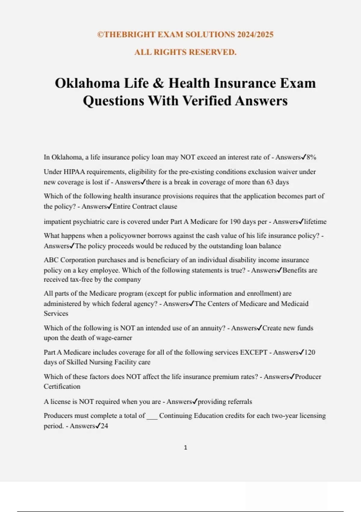 ©THEBRIGHT EXAM SOLUTIONS 2024/2025 ALL RIGHTS RESERVED. 1 Oklahoma Life & Health Insurance Exam Questions With Verified Answers In Oklahoma, a life insurance policy loan may NOT exceed an interest rate of - Answers8% Under HIPAA requirements, eligibility for the pre-existing conditions exclusion waiver under new coverage is lost if - Answersthere is a break in coverage of more than 63 days Which of the following health insurance provisions requires that the application becomes part of the policy? - AnswersEntire Contract clause impatient psychiatric care is covered under Part A Medicare for 190 days per - Answerslifetime What happens when a policyowner borrows against the cash value of his life insurance policy? - AnswersThe policy proceeds would be reduced by the outstanding loan balance ABC Corporation purchases and is beneficiary of an individual disability income insurance policy on a key employee. Which of the following statements is true? - AnswersBenefits are received tax-free by the company All parts of the Medicare program (except for public information and enrollment) are administered by which federal agency? - AnswersThe Centers of Medicare and Medicaid Services Which of the following is NOT an intended use of an annuity? - AnswersCreate new funds upon the death of wage-earner Part A Medicare includes coverage for all of the following services EXCEPT - Answers120 days of Skilled Nursing Facility care Which of these factors does NOT affect the life insurance premium rates? - AnswersProducer Certification A license is NOT required when you are - Answersproviding referrals Producers must complete a total of ___ Continuing Education credits for each two-year licensing period. - Answers24 ©THEBRIGHT EXAM SOLUTIONS 2024/2025 ALL RIGHTS RESERVED. 2 Which life insurance policy would be eligible to include an automatic premium loan provision? - AnswersWhole life A Guaranteed Renewable provision allows - Answerspremiums which can only be increased per rate class An insurance producer is BEST defined as - Answersa person who has a contract with an insurance company to represent it If a new policy is replacing an existing one, the insured is given the right to return for a full refund of at least how many days after policy delivery. - Answers20 All of these are used to prevent adverse selection in a group dental plan EXCEPT - Answersdecreased employee participation How long can an insurer legally defer paying the cash value of a surrendered life insurance policy? - Answers6 months The insurance information and Privacy Protection Act is designed to limit or direct the information collection activities of all of the following, EXCEPT: - AnswersCOBRA representatives Field underwriting by a producer - Answersmay result in the disclosure of hazardous activities of the applicant Joe is a military retiree after having served 20 years of active duty. Upon retiring, he requests reinstatement of his lapsed individual health policy and is denied. Which of the following is correct? - AnswersJoe cannot be denied reinstatement to his original individual health plan At what point are death proceeds paid in a joint life insurance policy? - AnswersWhen the first insured dies Emergency health care coverage for Medicare enrollees traveling abroad is - Answersa Medicare Supplement additional benefit Tim is covered by an accident and health insurance policy that may not be changed in any way by the insurer up to a stated age, as long as the premiums are paid. What type of policy is this? - AnswersNoncancelable How long does one premium payment cover in a single premium whole life policy? - Answersfull life of the policy The interest credited to the cash values of personally-owned non-qualified annuities is considered - Answerstax-deferred