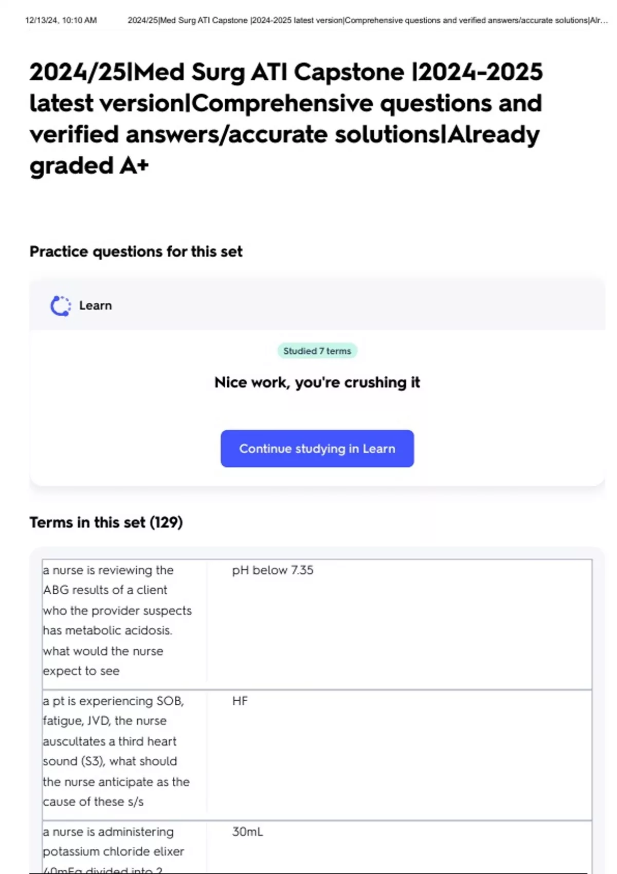 , 12/13/24, 10:10 AM 2024/25|Med Surg ATI Capstone |2024-2025 latest version|Comprehensive questions and verified answers/accurate solutions|Alr…