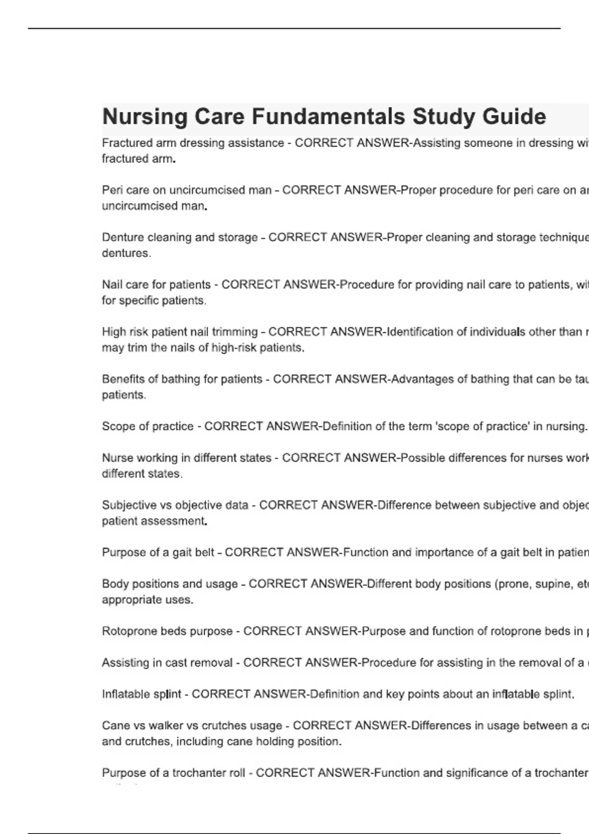 Nursing Care Fundamentals Study Guide Questions and Verified Answers |100% Correct | Complete solution | A+ Grade | Latest Update 2024 / 2025
