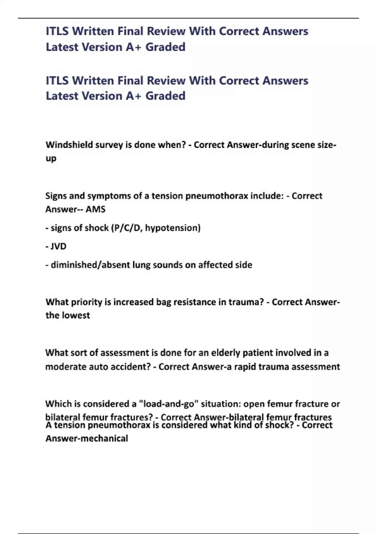 ITLS Written Final Review With Correct Answers Latest Version A+ Graded