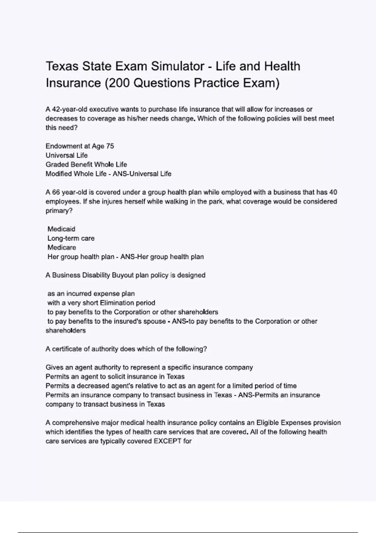 Texas State Exam Simulator - Life and Health Insurance (200 Questions Practice Exam) Questions and Verified Answers |100% Correct | Complete solution | A+ Grade | Latest Update 2024 / 2025