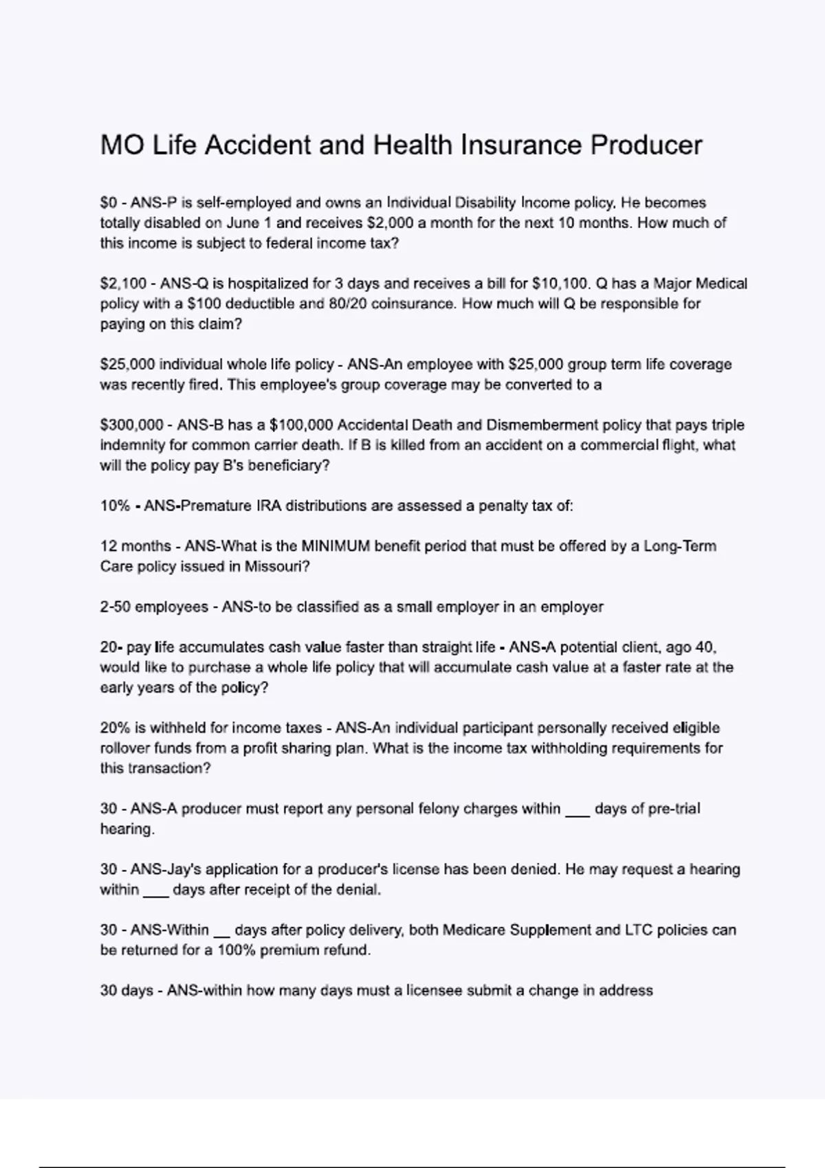 MO Life Accident and Health Insurance Producer Questions and Verified Answers |100% Correct | Complete solution | A+ Grade | Latest Update 2024 / 2025