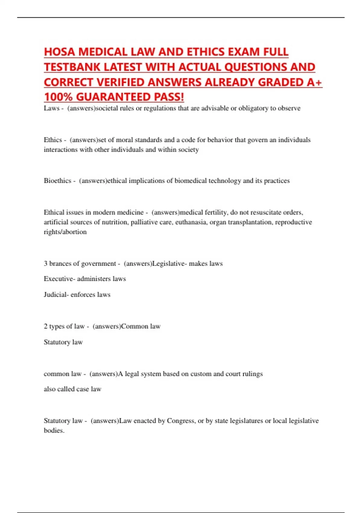 Statutory law - (answers)Law enacted by Congress, or by state legislatures or local legislative