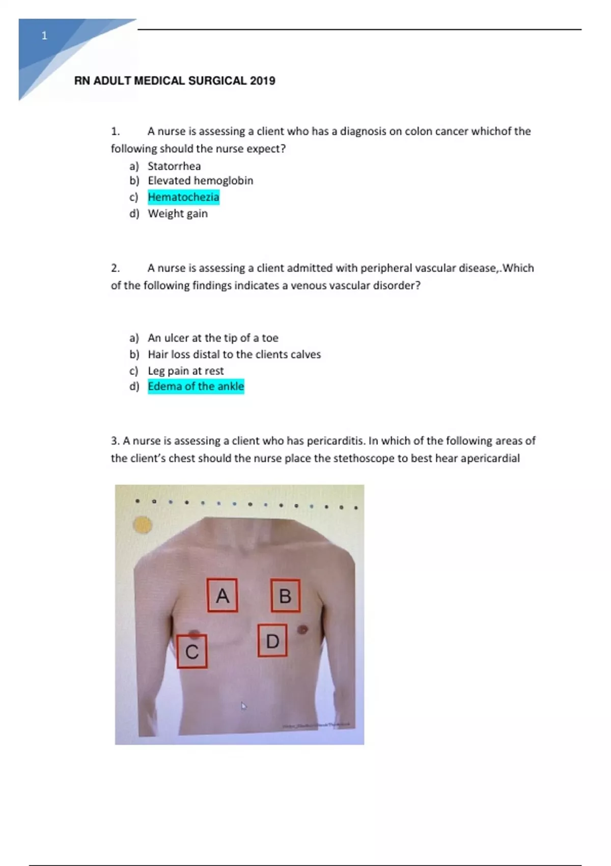 1. A nurse is assessing a client who has a diagnosis on colon cancer whichof the