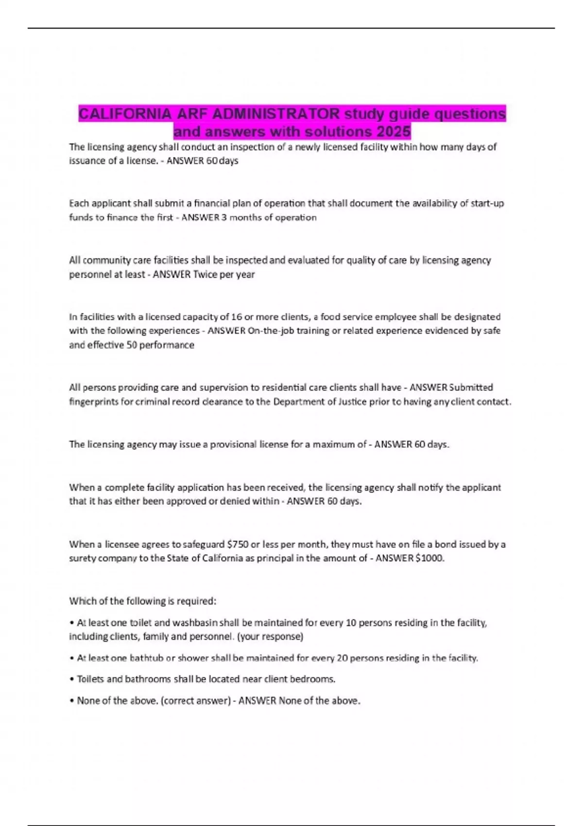 CALIFORNIA ARF ADMINISTRATOR study guide questions and answers with solutions 2025
