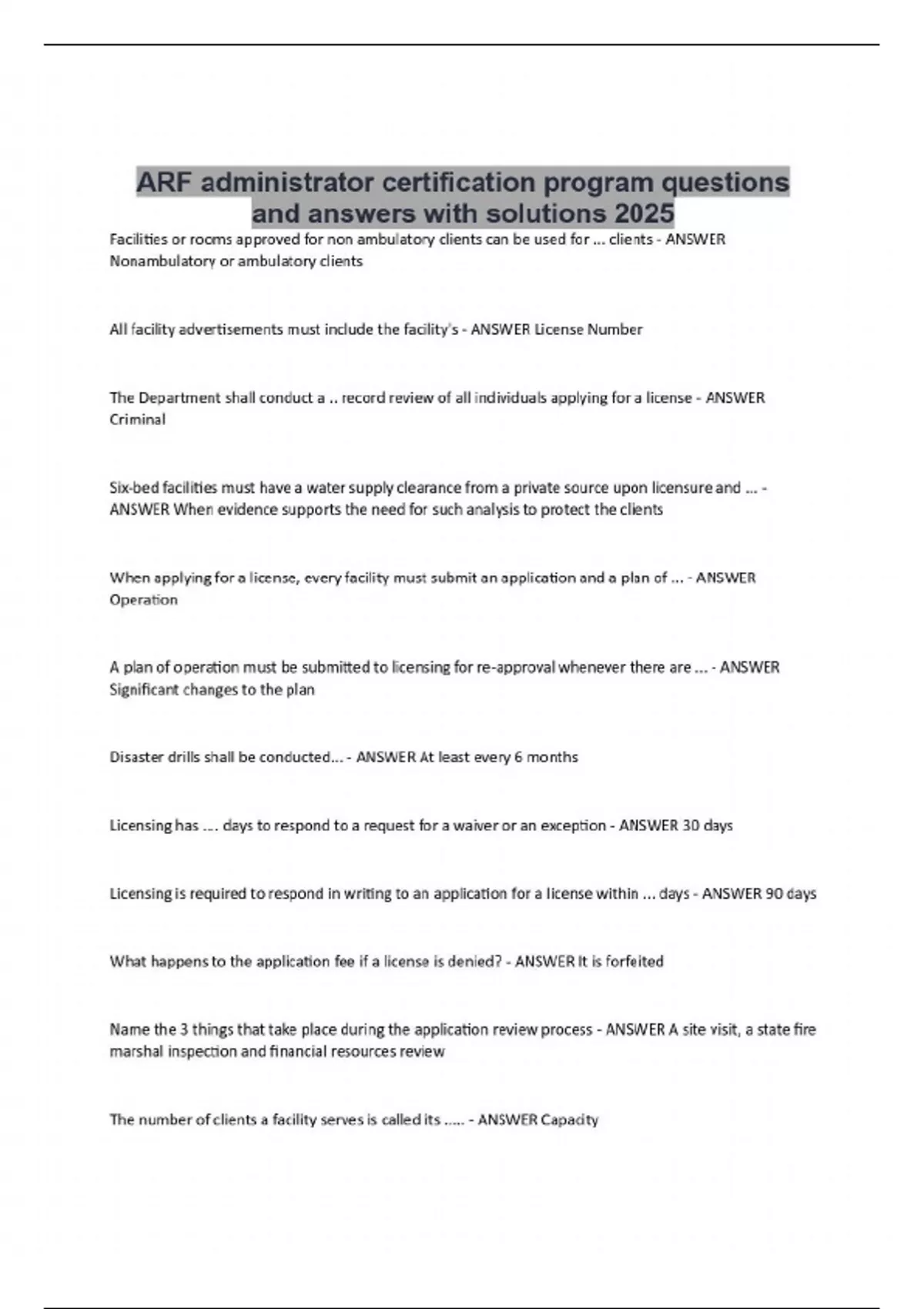 Facilities or rooms approved for non ambulatory clients can be used for ... clients - ANSWER Nonambulatory or ambulatory clients All facility advertisements must include the facility's - ANSWER License Number The Department shall conduct a .. record review of all individuals applying for a license - ANSWER Criminal Six-bed facilities must have a water supply clearance from a private source upon licensure and ... - ANSWER When evidence supports the need for such analysis to protect the clients When applying for a license, every facility must submit an application and a plan of ... - ANSWER Operation A plan of operation must be submitted to licensing for re-approval whenever there are ... - ANSWER Significant changes to the plan Disaster drills shall be conducted... - ANSWER At least every 6 months Licensing has .... days to respond to a request for a waiver or an exception - ANSWER 30 days Licensing is required to respond in writing to an application for a license within ... days - ANSWER 90 days What happens to the application fee if a license is denied? - ANSWER It is forfeited Name the 3 things that take place during the application review process - ANSWER A site visit, a state fire marshal inspection and financial resources review The number of clients a facility serves is called its ..... - ANSWER Capacity A provisional license can be issued for a maximum of how long? - ANSWER 12 months An initial license shall expire ... from the date of issue. - ANSWER 1 year The renewal of a license shall be filed not less than ... prior to the license expriration date. - ANSWER 30 days What must a facility do when they change their location or increase their capacity? - ANSWER File a new application A license can be transferred to a new owner. True or false -