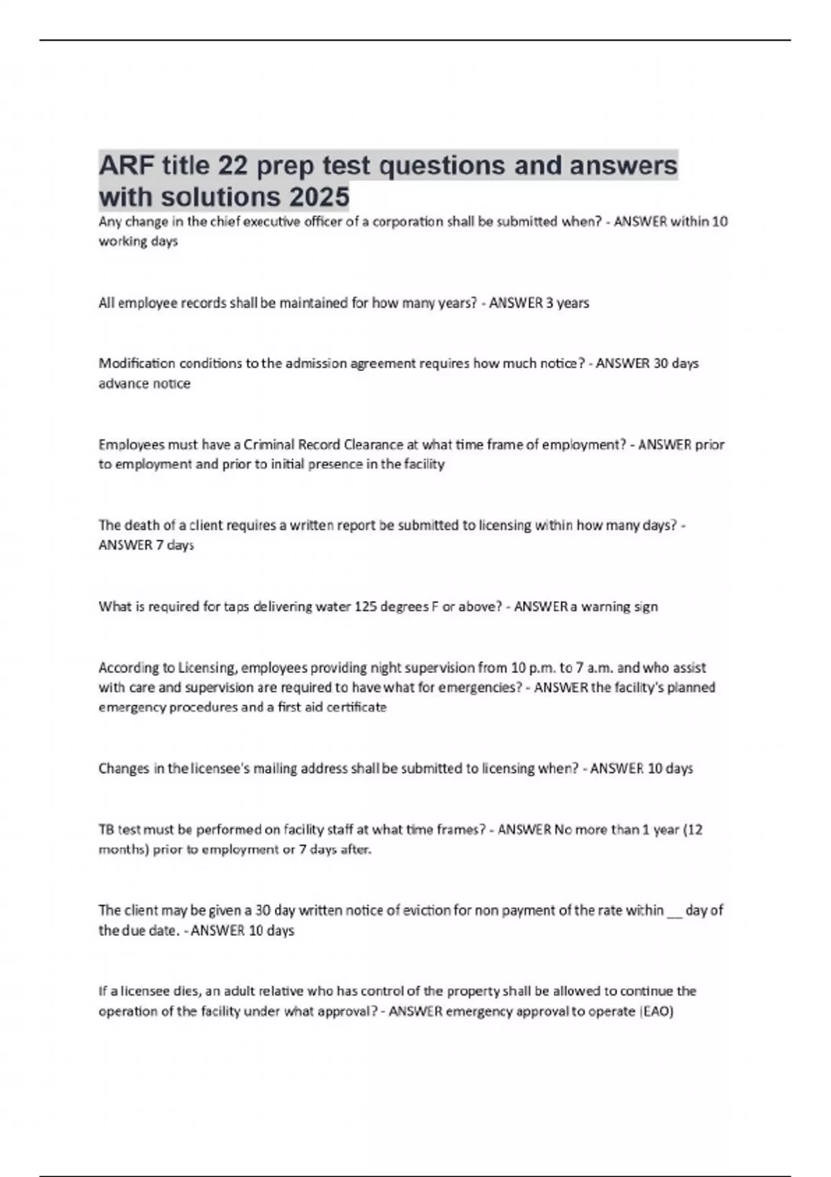 Any change in the chief executive officer of a corporation shall be submitted when? - ANSWER within 10 working days All employee records shall be maintained for how many years? - ANSWER 3 years Modification conditions to the admission agreement requires how much notice? - ANSWER 30 days advance notice Employees must have a Criminal Record Clearance at what time frame of employment? - ANSWER prior to employment and prior to initial presence in the facility The death of a client requires a written report be submitted to licensing within how many days? - ANSWER 7 days What is required for taps delivering water 125 degrees F or above? - ANSWER a warning sign According to Licensing, employees providing night supervision from 10 p.m. to 7 a.m. and who assist with care and supervision are required to have what for emergencies? - ANSWER the facility's planned emergency procedures and a first aid certificate Changes in the licensee's mailing address shall be submitted to licensing when? - ANSWER 10 days TB test must be performed on facility staff at what time frames? - ANSWER No more than 1 year (12 months) prior to employment or 7 days after. The client may be given a 30 day written notice of eviction for non payment of the rate within __ day of the due date. - ANSWER 10 days If a licensee dies, an adult relative who has control of the property shall be allowed to continue the operation of the facility under what approval? - ANSWER emergency approval to operate (EAO)