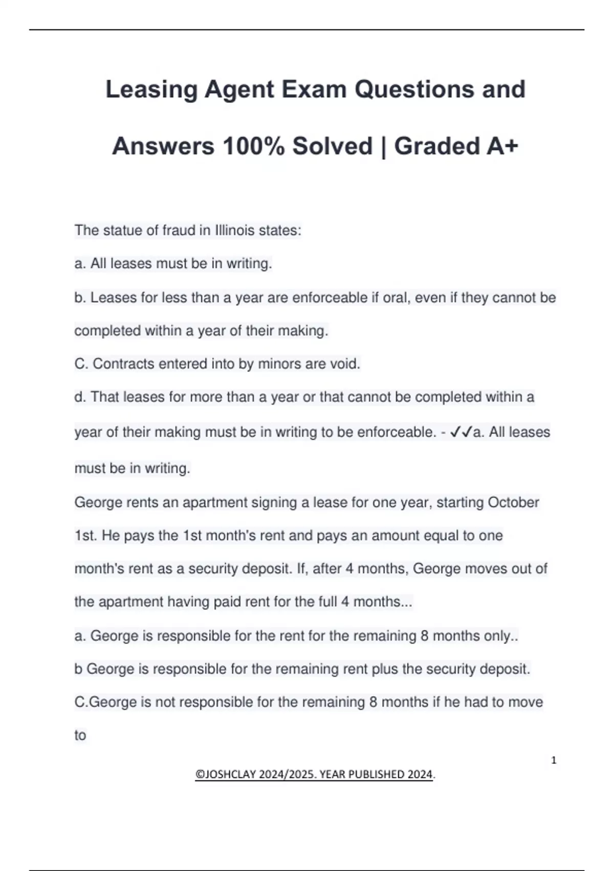 Leasing Agent Exam Questions and Answers 100% Solved | Graded A+ The statue of fraud in Illinois states: a. All leases must be in writing. b. Leases for less than a year are enforceable if oral, even if they cannot be completed within a year of their making. C. Contracts entered into by minors are void. d. That leases for more than a year or that cannot be completed within a year of their making must be in writing to be enforceable. - a. All leases must be in writing. George rents an apartment signing a lease for one year, starting October 1st. He pays the 1st month's rent and pays an amount equal to one month's rent as a security deposit. If, after 4 months, George moves out of the apartment having paid rent for the full 4 months... a. George is responsible for the rent for the remaining 8 months only.. b George is responsible for the remaining rent plus the security deposit. C.George is not responsible for the remaining 8 months if he had to move to