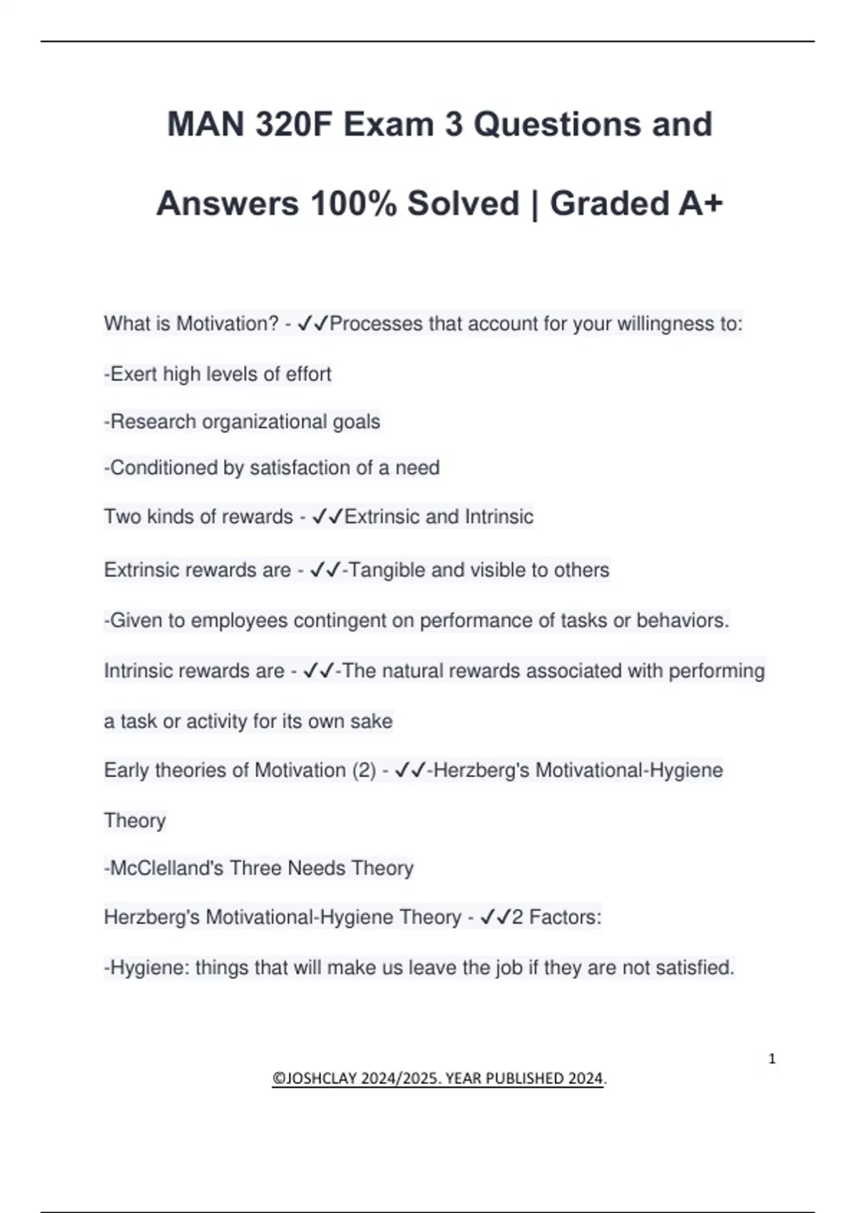 MAN 320F Exam 3 Questions and Answers 100% Solved | Graded A+ What is Motivation? - Processes that account for your willingness to: -Exert high levels of effort -Research organizational goals -Conditioned by satisfaction of a need Two kinds of rewards - Extrinsic and Intrinsic Extrinsic rewards are - -Tangible and visible to others -Given to employees contingent on performance of tasks or behaviors. Intrinsic rewards are - -The natural rewards associated with performing a task or activity for its own sake Early theories of Motivation (2) - -Herzberg's Motivational-Hygiene Theory -McClelland's Three Needs Theory Herzberg's Motivational-Hygiene Theory - 2 Factors: -Hygiene: things that will make us leave the job if they are not satisfied.
