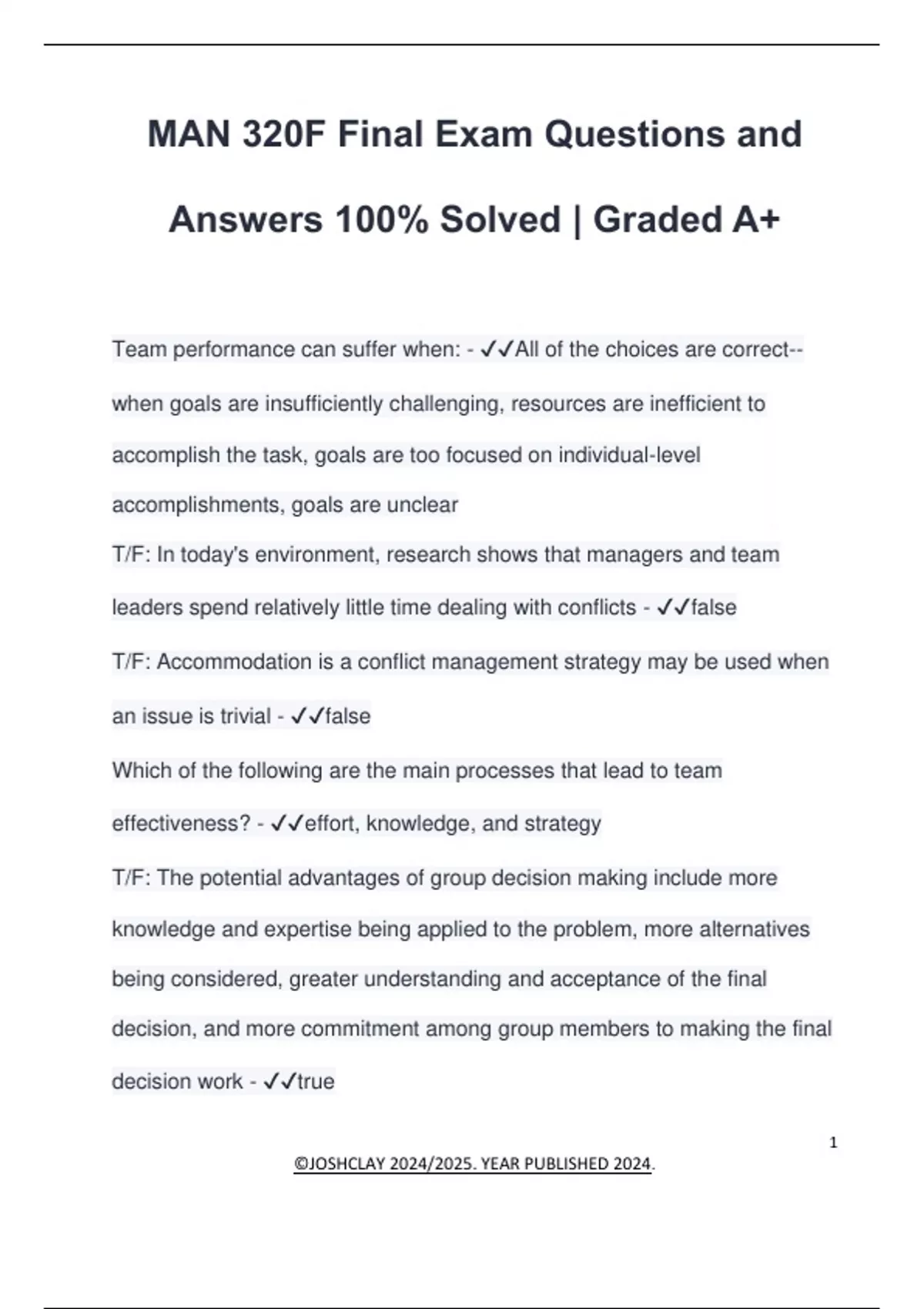 MAN 320F Final Exam Questions and Answers 100% Solved | Graded A+ Team performance can suffer when: - All of the choices are correct-- when goals are insufficiently challenging, resources are inefficient to accomplish the task, goals are too focused on individual-level accomplishments, goals are unclear T/F: In today's environment, research shows that managers and team leaders spend relatively little time dealing with conflicts - false T/F: Accommodation is a conflict management strategy may be used when an issue is trivial - false Which of the following are the main processes that lead to team effectiveness? - effort, knowledge, and strategy T/F: The potential advantages of group decision making include more knowledge and expertise being applied to the problem, more alternatives being considered, greater understanding and acceptance of the final decision, and more commitment among group members to making the final decision work - true