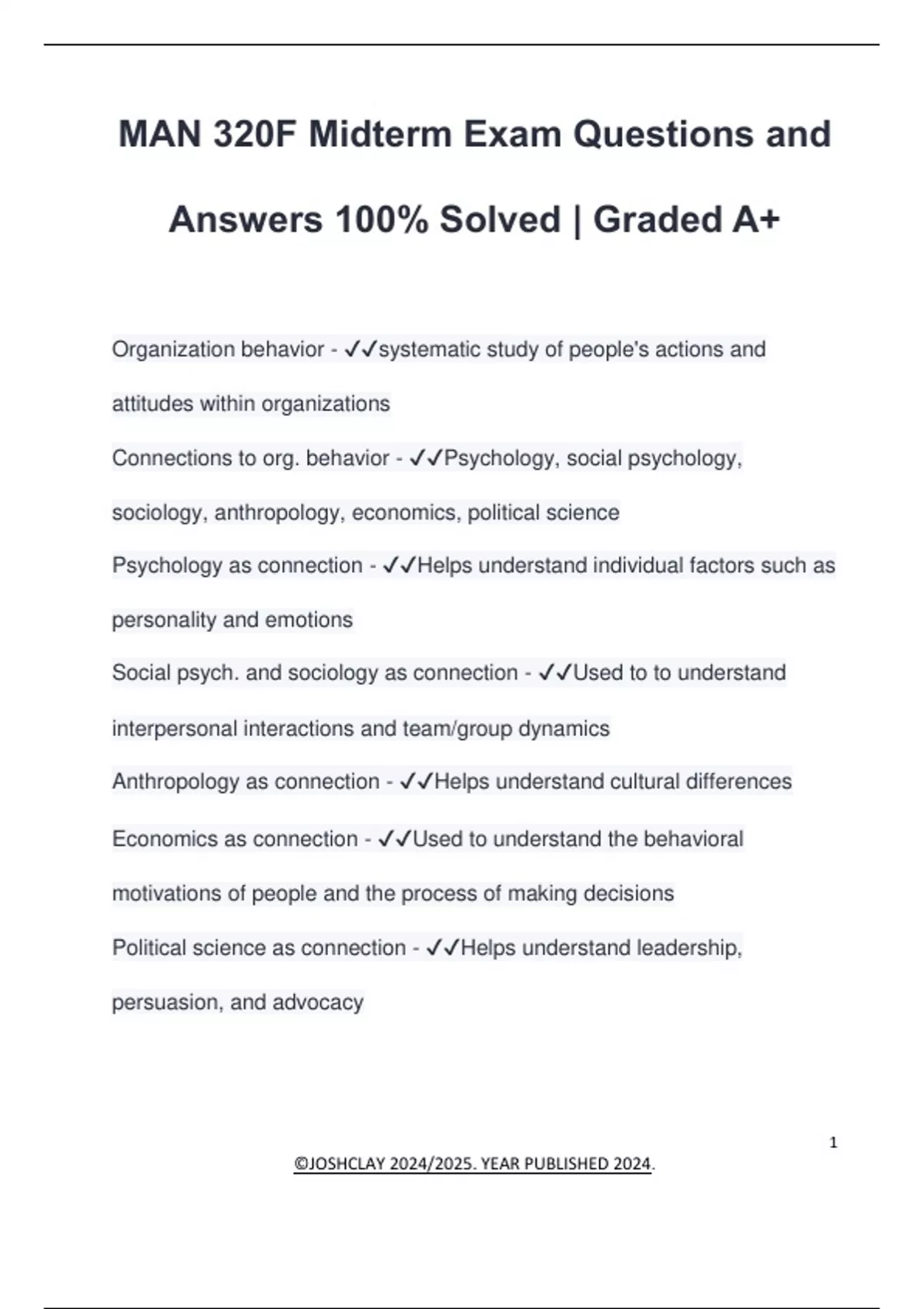 MAN 320F Midterm Exam Questions and Answers 100% Solved | Graded A+ Organization behavior - systematic study of people's actions and attitudes within organizations Connections to org. behavior - Psychology, social psychology, sociology, anthropology, economics, political science Psychology as connection - Helps understand individual factors such as personality and emotions Social psych. and sociology as connection - Used to to understand interpersonal interactions and team/group dynamics Anthropology as connection - Helps understand cultural differences Economics as connection - Used to understand the behavioral motivations of people and the process of making decisions Political science as connection - Helps understand leadership, persuasion, and advocacy