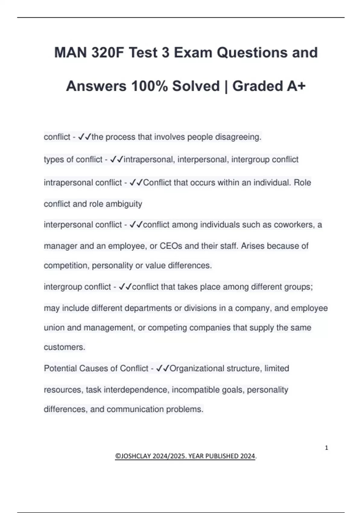 MAN 320F Test 3 Exam Questions and Answers 100% Solved | Graded A+ conflict - the process that involves people disagreeing. types of conflict - intrapersonal, interpersonal, intergroup conflict intrapersonal conflict - Conflict that occurs within an individual. Role conflict and role ambiguity interpersonal conflict - conflict among individuals such as coworkers, a manager and an employee, or CEOs and their staff. Arises because of competition, personality or value differences. intergroup conflict - conflict that takes place among different groups; may include different departments or divisions in a company, and employee union and management, or competing companies that supply the same customers. Potential Causes of Conflict - Organizational structure, limited resources, task interdependence, incompatible g