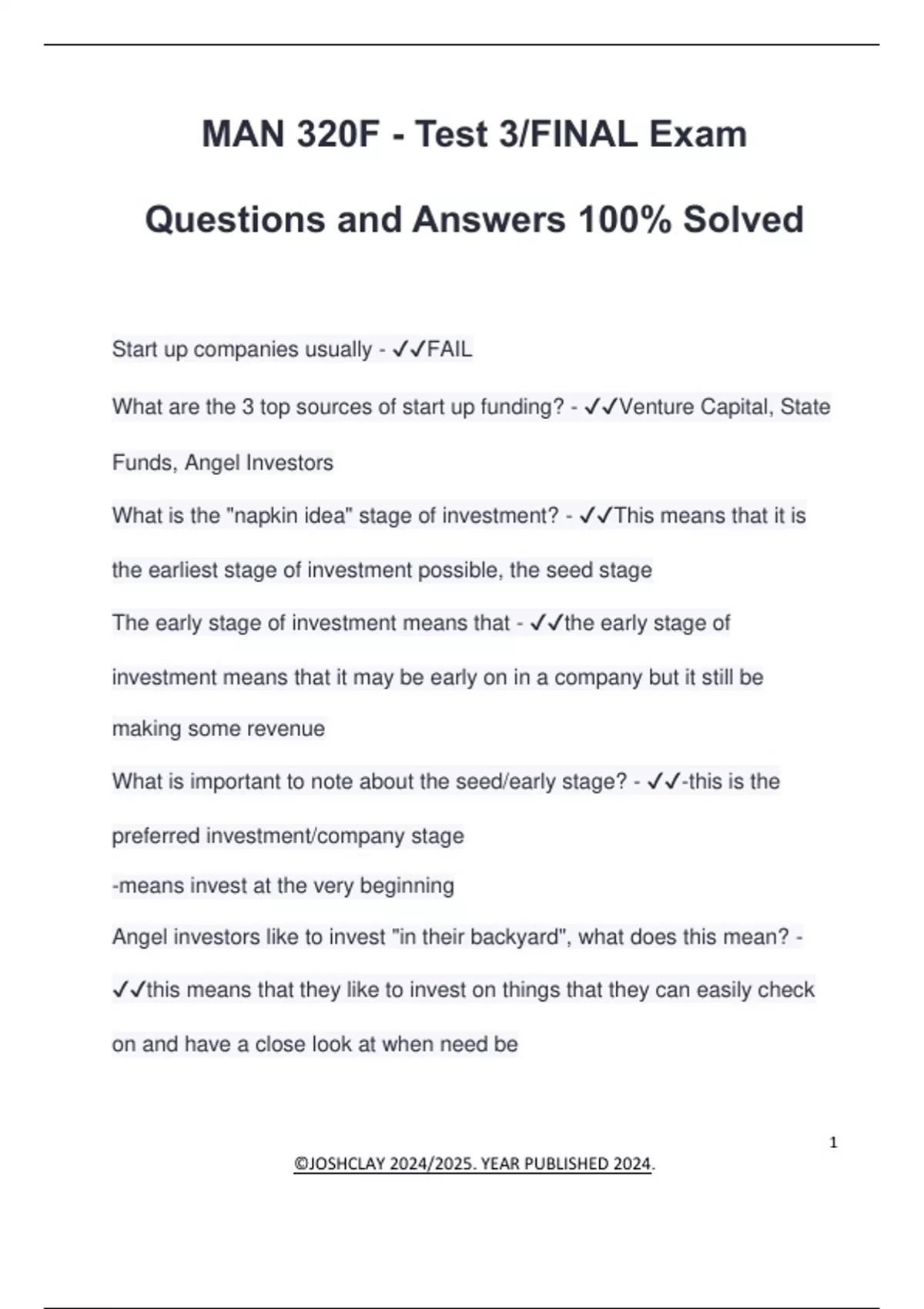 MAN 320F - Test 3/FINAL Exam Questions and Answers 100% Solved Start up companies usually - FAIL What are the 3 top sources of start up funding? - Venture Capital, State Funds, Angel Investors What is the "napkin idea" stage of investment? - This means that it is the earliest stage of investment possible, the seed stage The early stage of investment means that - the early stage of investment means that it may be early on in a company but it still be making some revenue What is important to note about the seed/early stage? - -this is the preferred investment/company stage -means invest at the very beginning Angel investors like to invest "in their backyard", what does this mean? - this means that they like to invest on things that they can easily check on and have a close look at when need be