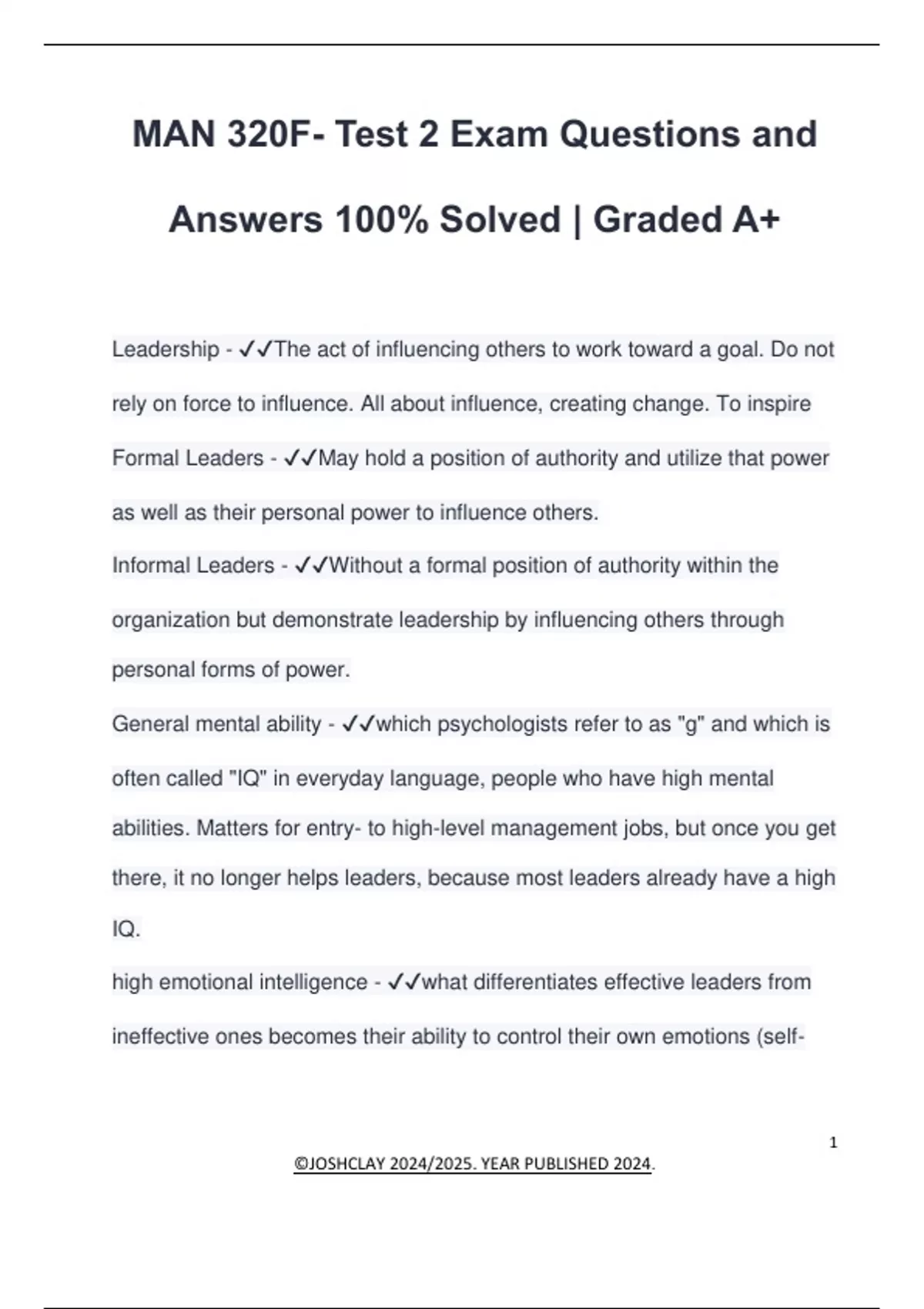 MAN 320F- Test 2 Exam Questions and Answers 100% Solved | Graded A+ Leadership - The act of influencing others to work toward a goal. Do not rely on force to influence. All about influence, creating change. To inspire Formal Leaders - May hold a position of authority and utilize that power as well as their personal power to influence others. Informal Leaders - Without a formal position of authority within the organization but demonstrate leadership by influencing others through personal forms of power. General mental ability - which psychologists refer to as "g" and which is often called "IQ" in everyday language, people who have high mental abilities. Matters for entry- to high-level management jobs, but once you get there, it no longer helps leaders, because most leaders already have a high IQ. high emotional intelligence - what differentiates effective leaders from ineffective ones becomes their ability to control their own emotions (self-