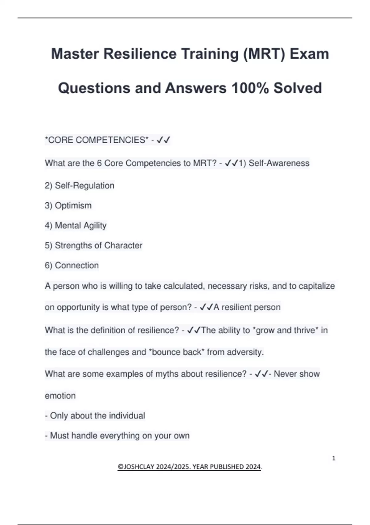 Master Resilience Training (MRT) Exam Questions and Answers 100% Solved *CORE COMPETENCIES* - What are the 6 Core Competencies to MRT? - 1) Self-Awareness 2) Self-Regulation 3) Optimism 4) Mental Agility 5) Strengths of Character 6) Connection A person who is willing to take calculated, necessary risks, and to capitalize on opportunity is what type of person? - A resilient person What is the definition of resilience? - The ability to *grow and thrive* in the face of challenges and *bounce back* from adversity. What are some examples of myths about resilience? - - Never show emotion - Only about the individual - Must handle everything on your own