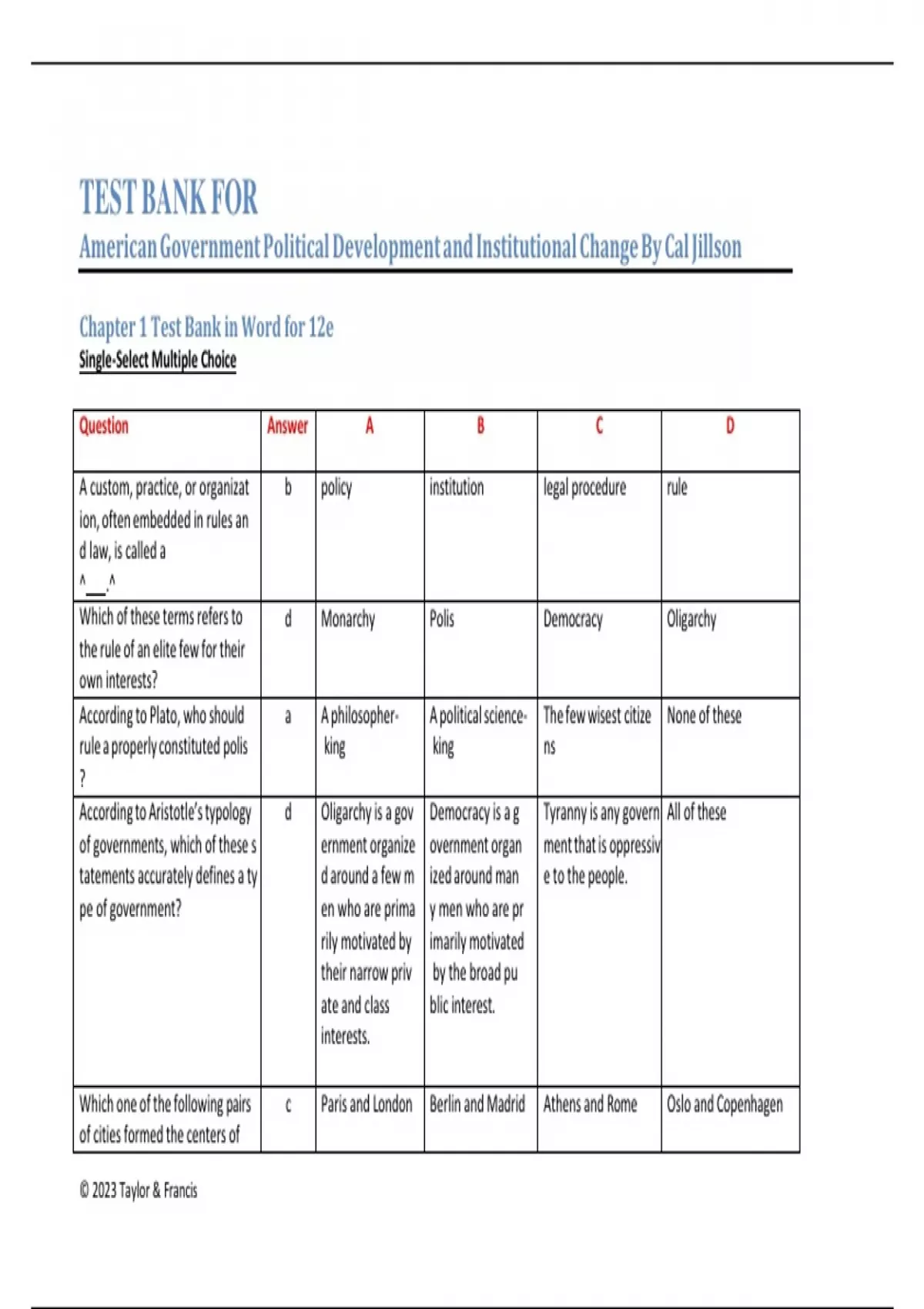 Instructor Manual With Test Bank for American Government Political Development and Institutional Change 7th Edition By Cal Jillson (All Chapters, 100 Original Verified, A+ Grade)