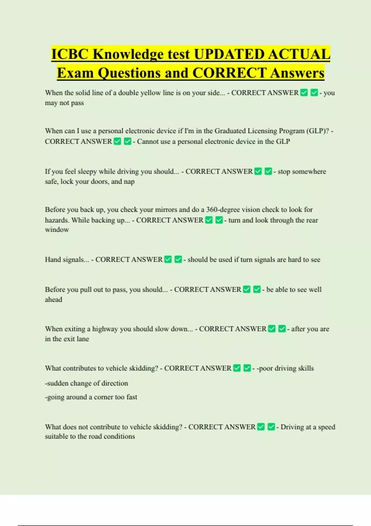 ICBC Knowledge test UPDATED ACTUAL Exam Questions and CORRECT Answers When the solid line of a double yellow line is on your side... - CORRECT ANSWER - you may not pass When can I use a personal electronic device if I'm in the Graduated Licensing Program (GLP)? - CORRECT ANSWER - Cannot use a personal electronic device in the GLP