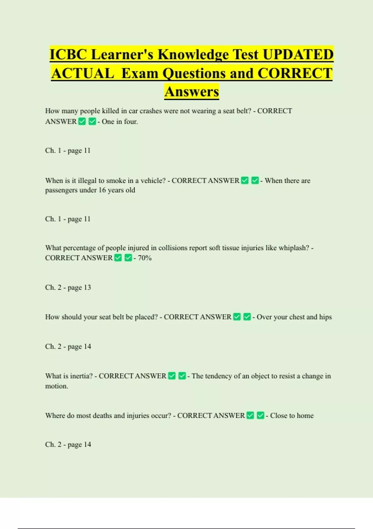 ICBC Learner's Knowledge Test UPDATED ACTUAL Exam Questions and CORRECT Answers How many people killed in car crashes were not wearing a seat belt? - CORRECT ANSWER - One in four. Ch. 1 - page 11 When is it illegal to smoke in a vehicle? - CORRECT ANSWER - When there are passengers under 16 years ol
