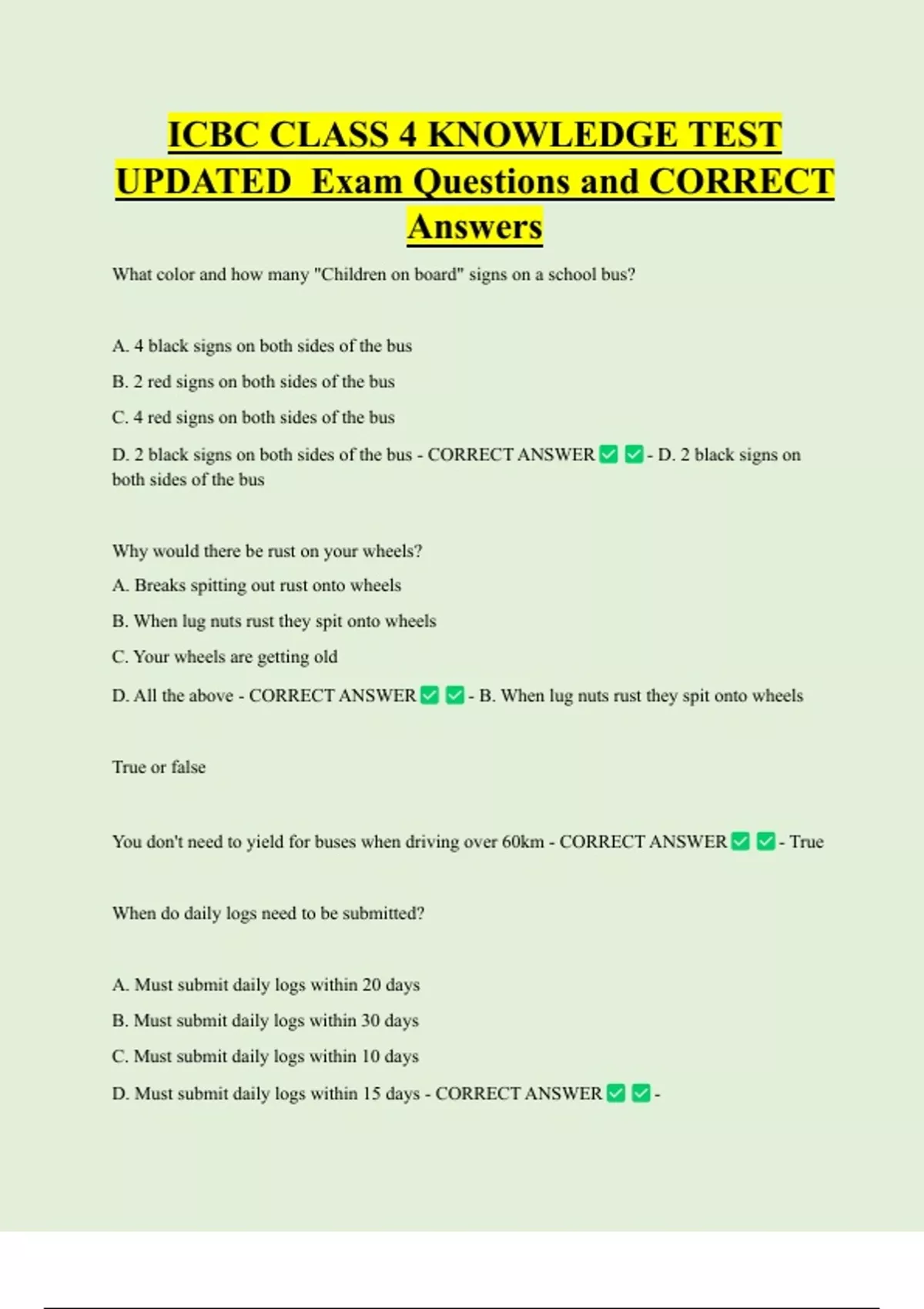 UPDATED Exam Questions and CORRECT Answers What color and how many "Children on board" signs on a school bus? A. 4 black signs on both sides of the bus B. 2 red signs on both sides of the bus C. 4 red signs on both sides of the bus D. 2 black signs on both sides of the bus - CORRECT ANSWER - D. 2 black signs on both sides of the bus