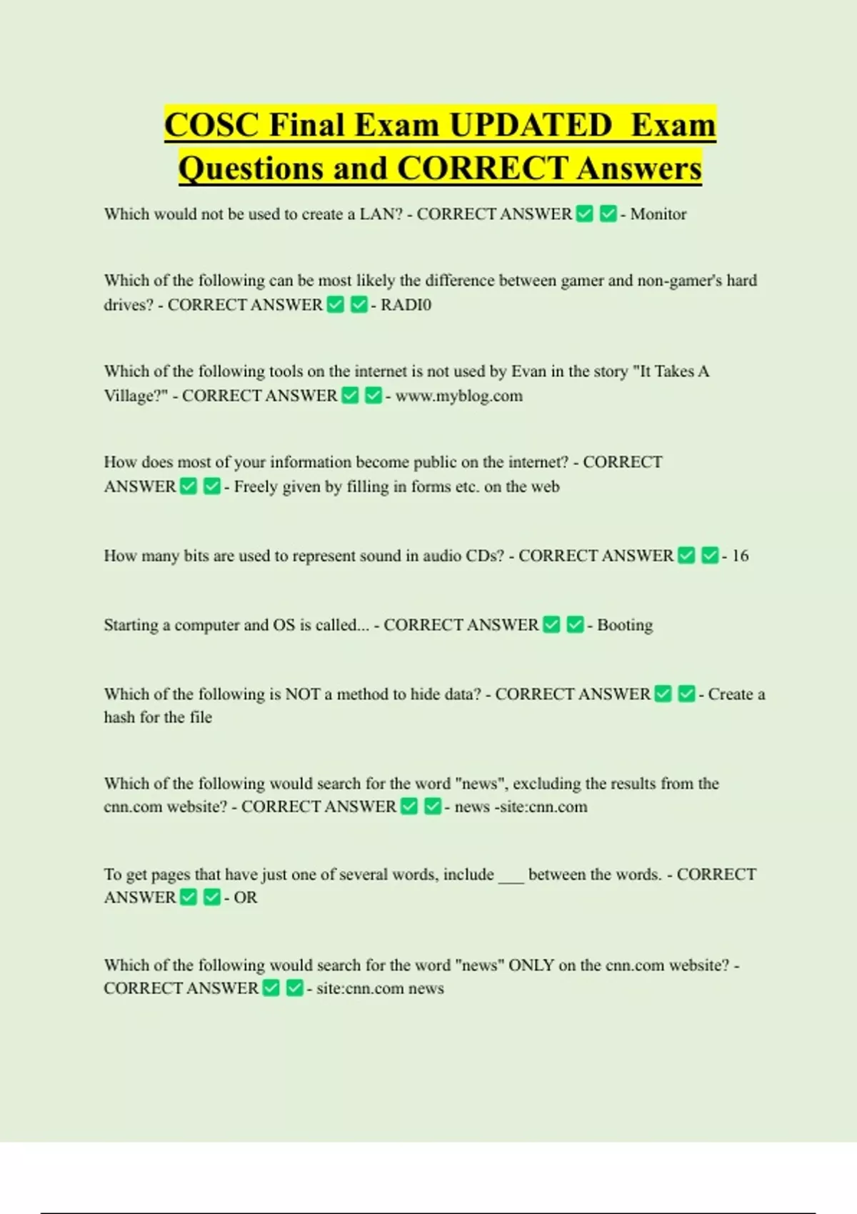 COSC Final Exam UPDATED Exam Questions and CORRECT Answers Which would not be used to create a LAN? - CORRECT ANSWER - Monitor Which of the following can be most likely the difference between gamer and non-gamer's hard drives? - CORRECT ANSWER - RADI0