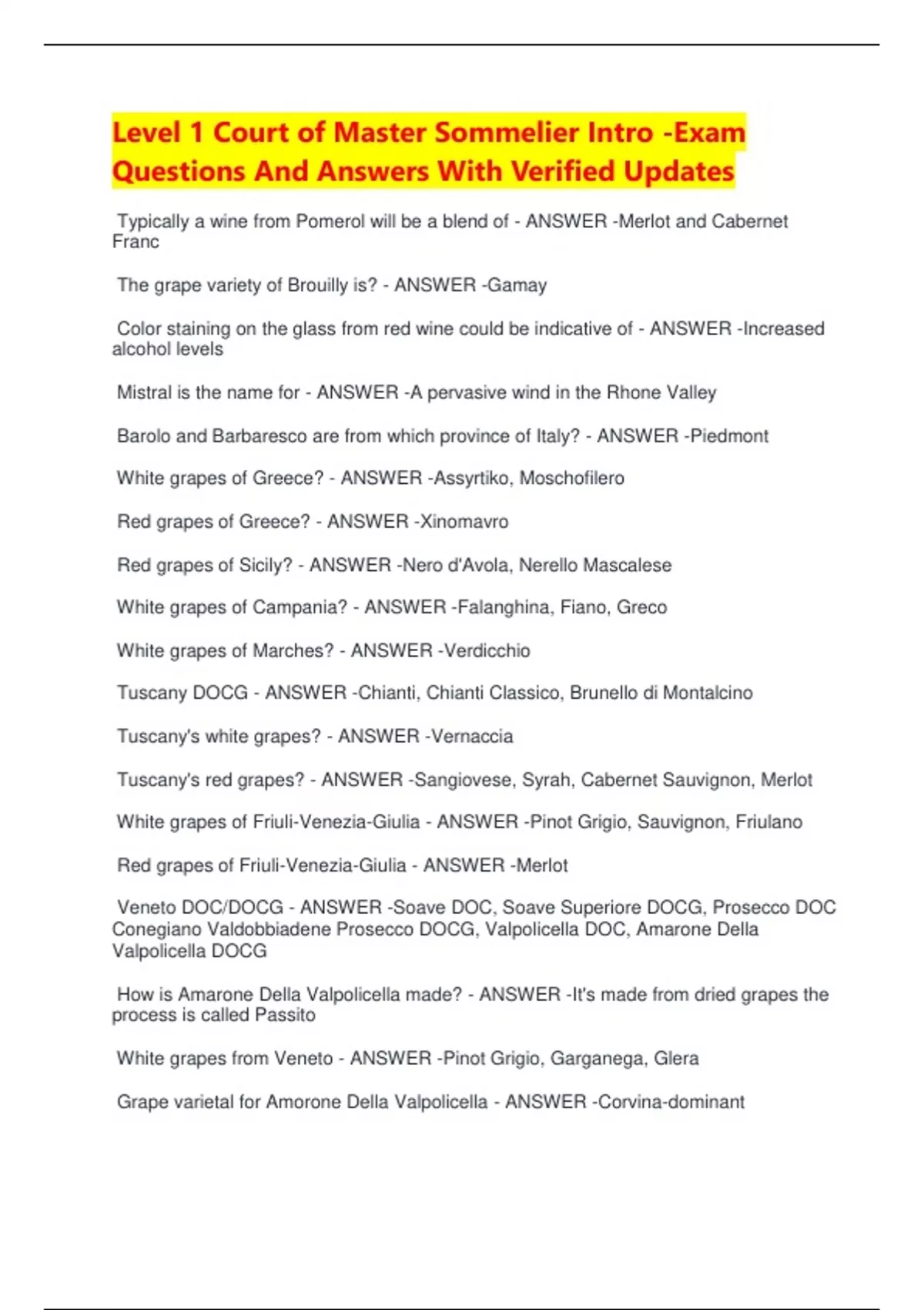 Level 1 Court of Master Sommelier Intro -Exam Questions And Answers With Verified Updates Typically a wine from Pomerol will be a blend of - ANSWER -Merlot and Cabernet Franc The grape variety of Brouilly is? - ANSWER -Gamay Color staining on the glass from red wine could be indicative of - ANSWER -Increased alcohol levels Mistral is the name for - ANSWER -A pervasive wind in the Rhone Valley Barolo and Barbaresco are from which province of Italy? - ANSWER -Piedmont White grapes of Greece? - ANSWER -Assyrtiko, Moschofilero Red grapes of Greece? - ANSWER -Xinomavro Red grapes of Sicily? - ANSWER -Nero d'Avola, Nerello Mascalese White grapes of Campania? - ANSWER -Falanghina, Fiano, Greco White grapes of Marches? - ANSWER -Verdicchio Tuscany DOCG - ANSWER -Chianti, Chianti Classico, Brunello di Montalcino Tuscany's white grapes? - ANSWER -Vernaccia Tuscany's red grapes? - ANSWER -Sangiovese, Syrah, Cabernet Sauvignon, Merlot White grapes of Friuli-Venezia-Giulia - ANSWER -Pinot Grigio, Sauvignon, Friulano Red grapes of Friuli-Venezia-Giulia - ANSWER -Merlot Veneto DOC/DOCG - ANSWER -Soave DOC, Soave Superiore DOCG, Prosecco DOC Conegiano Valdobbiadene Prosecco DOCG, Valpolicella DOC, Amarone Della Valpolicella DOCG How is Amarone Della Valpolicella made? - ANSWER -It's made from dried grapes the process is called Passito White grapes from Veneto - ANSWER -Pinot Grigio, Garganega, Glera Grape varietal for Amorone Della Valpolicella - ANSWER -Corvina-dominant White grapes from Trento-Alto Adige - ANSWER -Pinot Grigio Viticulture - ANSWER -The study of growing grapes Microclimate - ANSWER -The area in the vineyard Macroclimate - ANSWER -The area around the vineyard Latitudinal wine growing zones - ANSWER -30* and 50* Old World Countries - ANSWER -France, Italy, Spain, Portugal, Germany, Austria New World Counties - ANSWER -North America, South America, South Africa, Australia, New Zealand Old World wines are? - ANSWER -More earthy and mineraly in flavor New World wines are? - ANSWER -More fruit driven Vitis vinifera - ANSWER -Species of grape grown for wine making Terroir - ANSWER -A sense of place Alcoholic fermentation - ANSWER -Sugar+yeast=alcohol+C02 Malolactic Fermentation - ANSWER -Tart malic acids converted to softer tasting lactic acids. Butter (Diacetyl), buttered popcorn, cream Autolysis - ANSWER -Destruction of cells or tissues by their own enzymes. Dead yeast Chaptalization - ANSWER -Addition of sugar to must to increase the final alcohol content Where would Chaptalization occur? - ANSWER -Cooler climates Acidification - ANSWER -The addition of acids to must or finished wine Where would acidification occur? - ANSWER -Warmer climates Fining - ANSWER -Cold stabilization, clarification Filtration - ANSWER -Microbial stability Deductive tasting - ANSWER -Sight, Nose, Palate, Initial Conclusion, Final Conclusion Brightness scale - ANSWER -Dull, hazy, bright, day-bright, star bright Concentration scale - ANSWER -Pale, medium, deep Sight gives clues as to... - ANSWER -Age, storage conditions, and possibly grape variety Color scales for white wines - ANSWER -Straw, yellow, gold, amber Color scale for red wines - ANSWER -Purple, ruby red, garnet Secondary colors and hues for white wines - ANSWER -Silver, green, copper Secondary color and hues for red wines - ANSWER -Orange, brown, blue Viscosity - ANSWER -High sugar and alcohol TCA - ANSWER -Cork taint Volatile Acidity (VA) - ANSWER -Wet basemen Sulfur dioxide (S02) - ANSWER -Matchstick Brettanomyces - ANSWER -Horse Hydrogen Sulfide (H2S) - ANSWER -Rotten eggs Ethyl Acetate - ANSWER -Nail polish F.E.W. - ANSWER -Fruit, Non-Fruit, Earth, Wood Food and wine pairing - ANSWER -What grows together goes together AOC - ANSWER -Appellation D'Origine Controlee Sediment ine wine can be due to - ANSWER -Tartrates Tannins are sensed on the palate as - ANSWER -Bitterness and/or astringency Selection de Grains Noble is what type of wine? - ANSWER -Botrytis dessert wine from a single noble variety Chateauneuf-du-Pape is located in - ANSWER -Rhone Valle