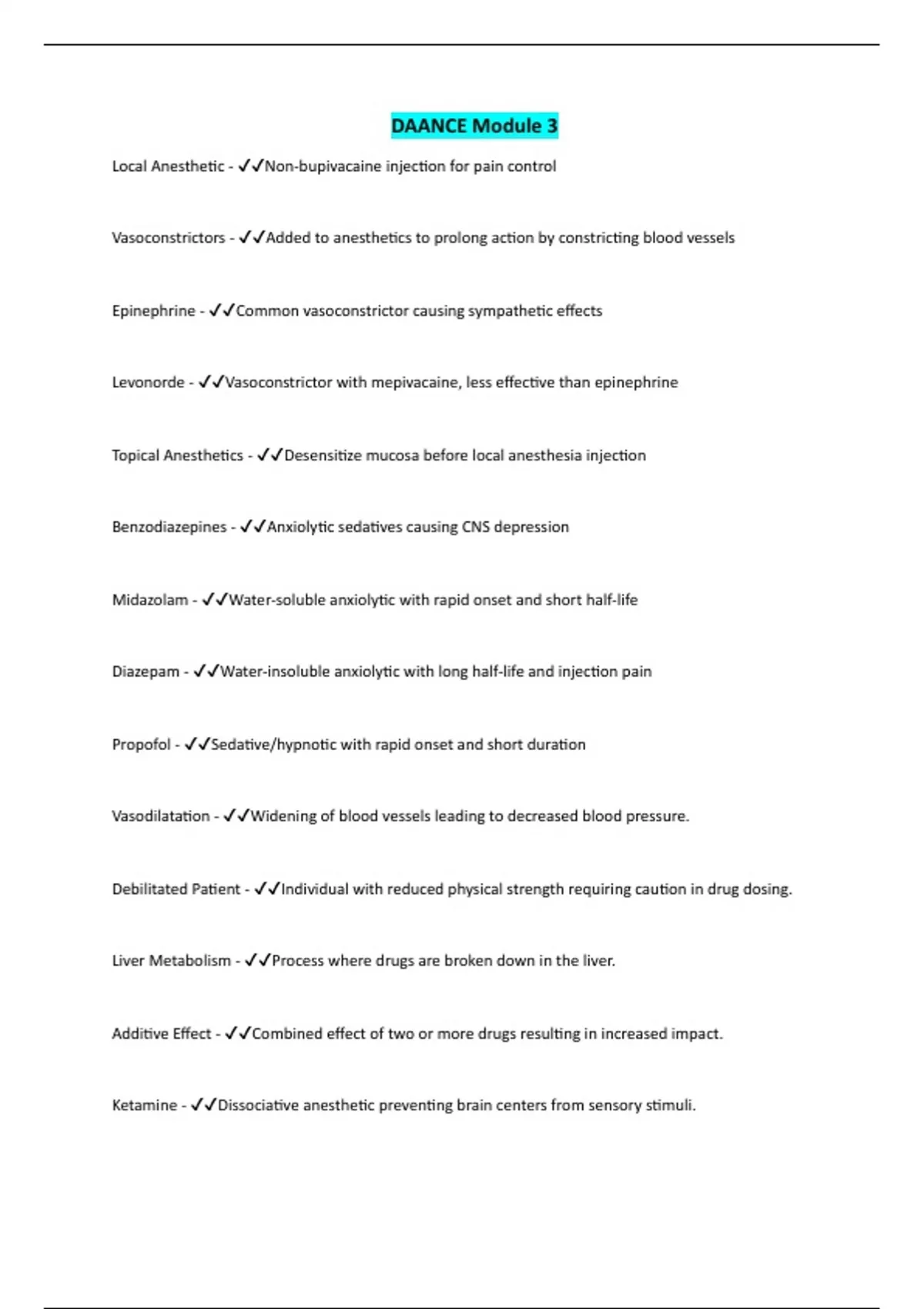 DAANCE Module 3 Local Anesthetic - Non-bupivacaine injection for pain control Vasoconstrictors - Added to anesthetics to prolong action by constricting blood vessels