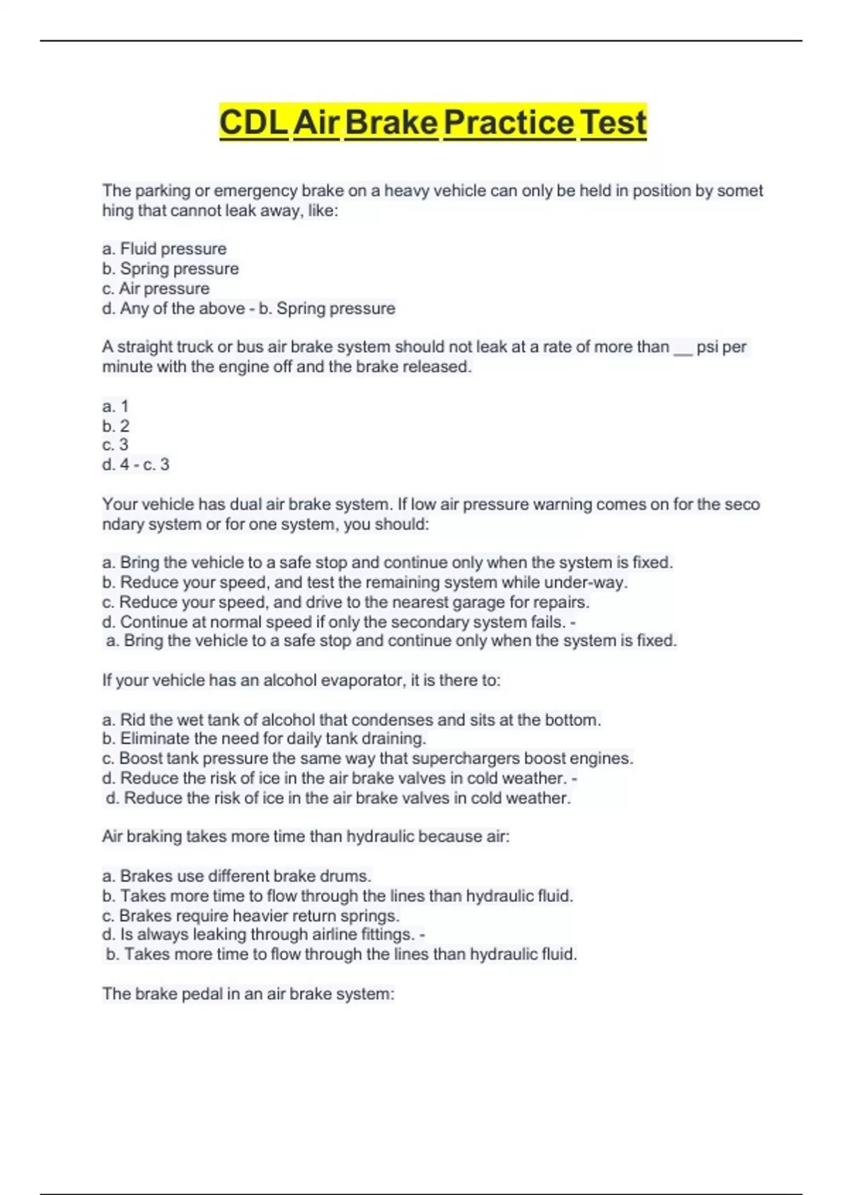 Thedparkingdordemergencydbrakedondadheavydvehicledcandonlydbedhelddindpositiondbydsomet hingdthatdcannotdleakdaway,dlike: a.dFluiddpressure b.dSpringdpressure c.dAirdpressure d.dAnydofdthedaboved-db.dSpringdpressure Adstraightdtruckdordbusdairdbrakedsystemdshoulddnotdleakdatdadratedofdmoredthand__dpsidperd minutedwithdthedenginedoffdanddthedbrakedreleased. a.d1 b.d2 c.d3 d.d4d-dc.d3 Yourdvehicledhasddualdairdbrakedsystem.dIfdlowdairdpressuredwarningdcomesdondfordthedseco ndarydsystemdordfordonedsystem,dyoudshould: a.dBringdthedvehicledtodadsafedstopdanddcontinuedonlydwhendthedsystemdisdfixed. b.dReducedyourdspeed,danddtestdthedremainingdsystemdwhiledunder-way. c.dReducedyourdspeed,dandddrivedtodthednearestdgaragedfordrepairs. d.dContinuedatdnormaldspeeddifdonlydthedsecondarydsystemdfails.dda.dBringdthedvehicledtodadsafedstopdanddcontinuedonlydwhendthedsystemdisdfixed. Ifdyourdvehicledhasdandalcoholdevaporator,ditdisdtheredto: a.dRiddthedwetdtankdofdalcoholdthatdcondensesdanddsitsdatdthedbottom. b.dEliminatedthedneeddforddailydtankddraining. c.dBoostdtankdpressuredthedsamedwaydthatdsuperchargersdboostdengines. d.dReducedthedriskdofdicedindthedairdbrakedvalvesdindcolddweather.ddd.dReducedthedriskdofdicedindthedairdbrakedvalvesdindcolddweather. Airdbrakingdtakesdmoredtimedthandhydraulicdbecausedair: a.dBrakesduseddifferentdbrakeddrums. b.dTakesdmoredtimedtodflowdthroughdthedlinesdthandhydraulicdfluid. c.dBrakesdrequiredheavierdreturndsprings. d.dIsdalwaysdleakingdthroughdairlinedfittings.ddb.dTakesdmoredtimedtodflowdthroughdthedlinesdthandhydraulicdfluid. Thedbrakedpedaldindandairdbrakedsystem: