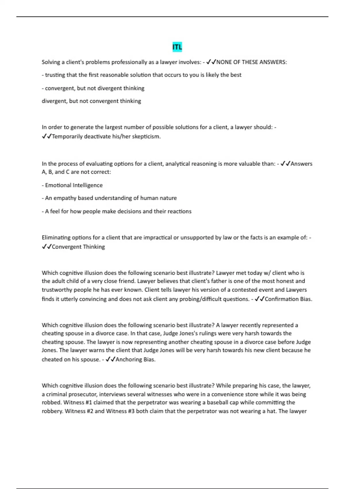 ITL Solving a client's problems professionally as a lawyer involves: - NONE OF THESE ANSWERS: - trusting that the first reasonable solution that occurs to you is likely the best - convergent, but not divergent thinking divergent, but not convergent thinking