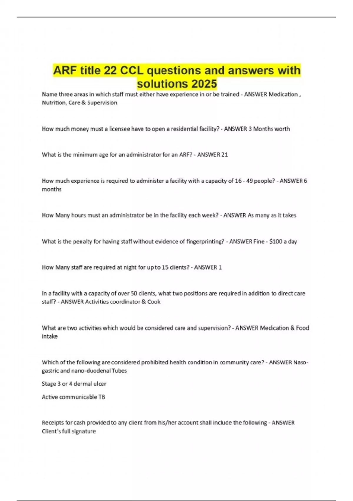 Name three areas in which staff must either have experience in or be trained - ANSWER Medication , Nutrition, Care & Supervision How much money must a licensee have to open a residential facility? - ANSWER 3 Months worth What is the minimum age for an administrator for an ARF? - ANSWER 21 How much experience is required to administer a facility with a capacity of 16 - 49 people? - ANSWER 6 months How Many hours must an administrator be in the facility each week? - ANSWER As many as it takes What is the penalty for having staff without evidence of fingerprinting? - ANSWER Fine - $100 a day How Many staff are required at night for up to 15 clients? - ANSWER 1 In a facility with a capacity of over 50 clients, what two positions are required in addition to direct care staff? - ANSWER Activities coordinator & Cook What are two activities which would be considered care and supervision? - ANSWER Medication & Food intake Which of the following are considered prohibited health condition in community care? - ANSWER Naso-gastric and nano-duodenal Tubes Stage 3 or 4 dermal ulcer