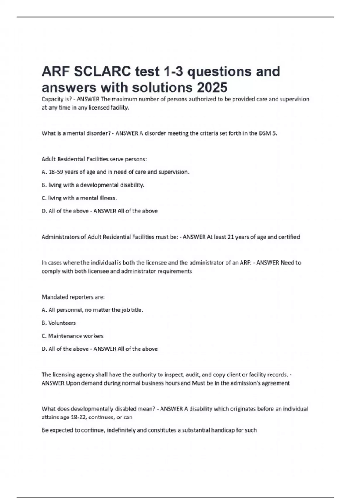 Capacity is? - ANSWER The maximum number of persons authorized to be provided care and supervision at any time in any licensed facility. What is a mental disorder? - ANSWER A disorder meeting the criteria set forth in the DSM 5. Adult Residential Facilities serve persons: A. 18-59 years of age and in need of care and supervision. B. living with a developmental disability. C. living with a mental illness. D. All of the above - ANSWER All of the above Administrators of Adult Residential Facilities must be: - ANSWER At least 21 years of age and certified In cases where the individual is both the licensee and the administrator of an ARF: - ANSWER Need to comply with both licensee and administrator requirements Mandated reporters are: A. All personnel, no matter the job title. B. Volunteers C. Maintenance workers D. All of the above - ANSWER All of the above The licensing agency shall have the authority to inspect, audit, and copy client or facility records. - ANSWER Upon demand during normal business hours and Must be in the admission's agreement