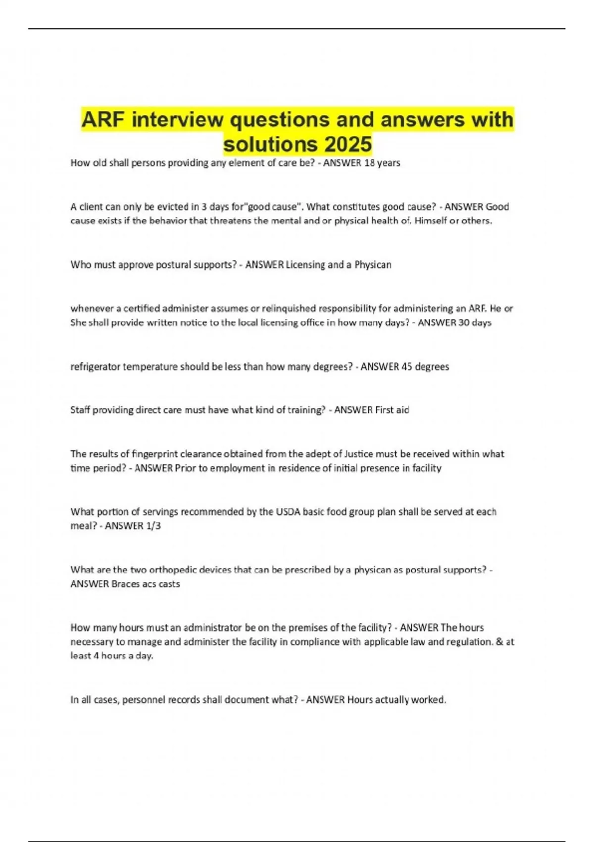 How old shall persons providing any element of care be? - ANSWER 18 years A client can only be evicted in 3 days for"good cause". What constitutes good cause? - ANSWER Good cause exists if the behavior that threatens the mental and or physical health of. Himself or others. Who must approve postural supports? - ANSWER Licensing and a Physican whenever a certified administer assumes or relinquished responsibility for administering an ARF. He or She shall provide written notice to the local licensing office in how many days? - ANSWER 30 days refrigerator temperature should be less than how many degrees? - ANSWER 45 degrees Staff providing direct care must have what kind of training? - ANSWER First aid The results of fingerprint clearance obtained from the adept of Justice must be received within what time period? - ANSWER Prior to employment in residence of initial presence in facility What portion of servings recommended by the USDA basic food group plan shall be served at each meal? - ANSWER 1/3 What are the two orthopedic devices that can be prescribed by a physican as postural supports? - ANSWER Braces acs casts How many hours must an administrator be on the premises of the facility? - ANSWER The hours necessary to manage and administer the facility in compliance with applicable law and regulation. & at least 4 hours a day. In all cases, personnel records shall document what? - ANSWER Hours actually worked. A written relocation plan to move a client shall not ex