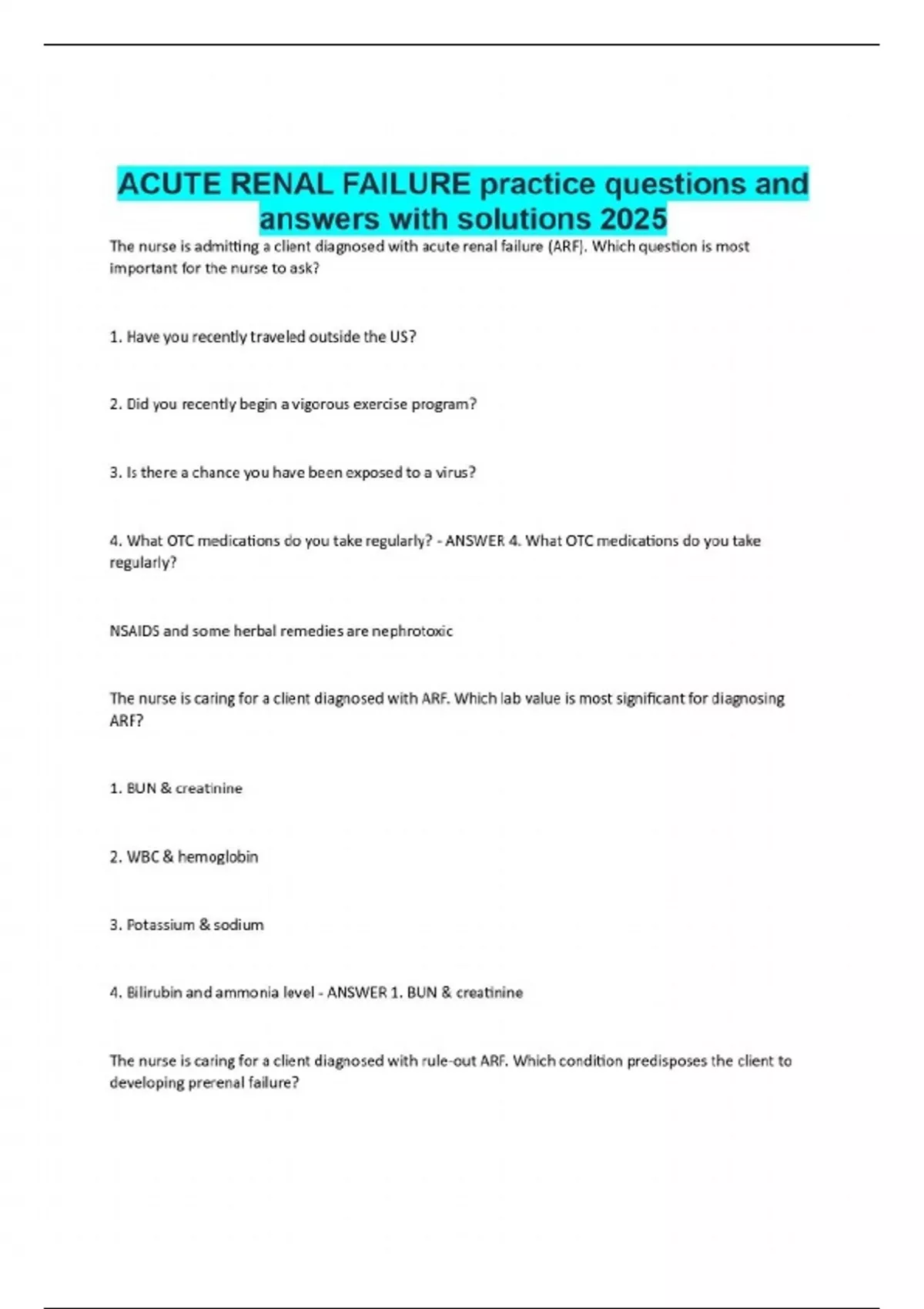 The nurse is admitting a client diagnosed with acute renal failure (ARF). Which question is most important for the nurse to ask? 1. Have you recently traveled outside the US? 2. Did you recently begin a vigorous exercise program? 3. Is there a chance you have been exposed to a virus? 4. What OTC medications do you take regularly? - ANSWER 4. What OTC medications do you take regularly? NSAIDS and some herbal remedies are nephrotoxic The nurse is caring for a client diagnosed with ARF. Which lab value is most significant for diagnosing ARF? 1. BUN & creatinine 2. WBC & hemoglobin 3. Potassium & sodium 4. Bilirubin and ammonia level - ANSWER 1. BUN & creatinine The nurse is caring for a client diagnosed with rule-out ARF. Which condition predisposes the client to developing prerenal failure?